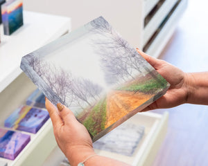 The photo is printed on professional grade metallic photographic paper, using archival inks. It is then mounted on the back of an acrylic (plexiglass) block. It is finished with diamond polishing, buffing and final hand polish.