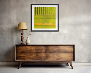 Dive into the vibrant patchwork of canola fields with this wall art print. An abstract aerial shot of farmland reveals the brilliance of spring's colours, accentuated by the geometric lines of roads and tractor tracks that intricately break up the crops. This composition celebrates the beauty of agricultural landscapes impacted by human cultivation. Ideal for those who appreciate artistry in agriculture and the changing seasons, this print transforms any space into a dynamic showcase of rural charm. Perfect for contemporary interiors, this print adds a burst of colour and texture to your decor, creating a focal point that sparks curiosity.