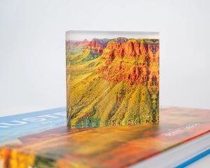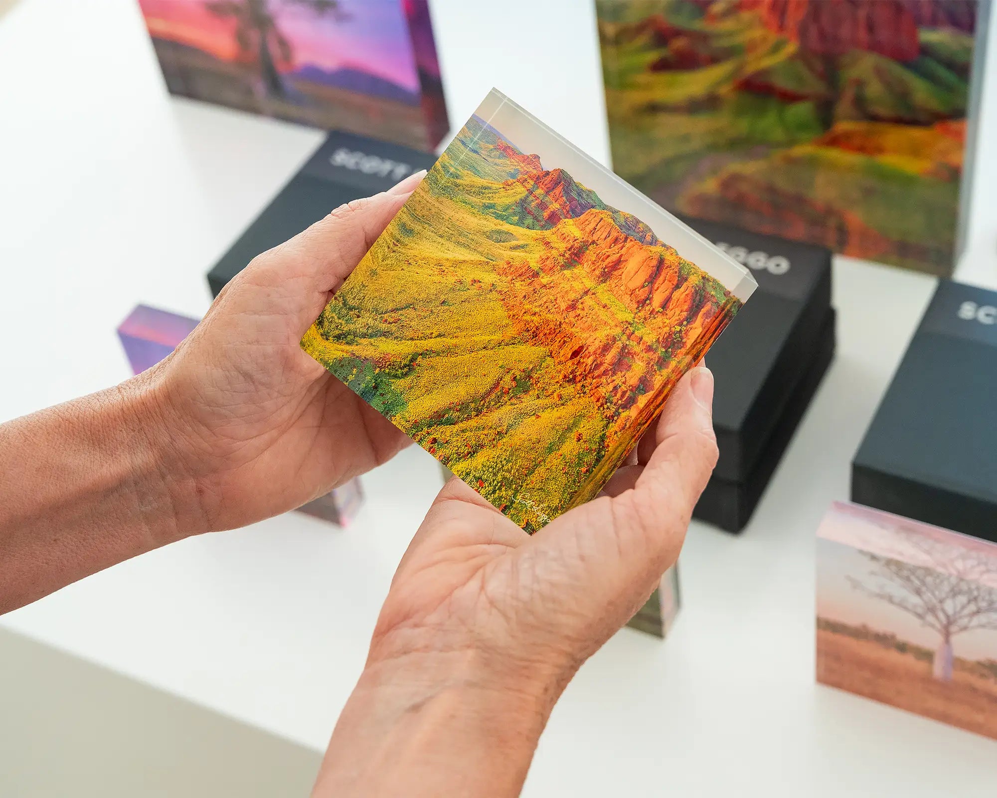 Our acrylic blocks give the photo a three dimensional look. They are perfect for desks, bookshelves, mantlepieces, bed side tables - any horizontal surface.
