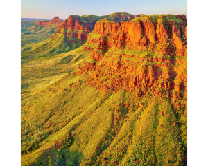 "The cliffs of the Ragged Range appear a little different to many of the other areas of the Kimberley. I wanted to capture them with direct light on them to distinguish their unique features. I was in luck with terrific light on this occasion highlighting the greens of the area from the wet season against the striking reds of the rocks. It made for a fleeting but very impressive scene. Getting the timing right was the challenge by photographing out of a helicopter." - Scott