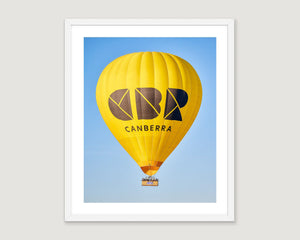 This wall art print is perfect for anyone who has taken a hot air balloon flight with Balloon Aloft on the distinctive yellow Visit Canberra CBR branded balloon. The bright yellow set against the blue sky will add a vibrant colour to any wall space this is hung upon. Purchase this as a reminder of your flight or add a distinctive touch of Canberra to your corporate office with this very Canberra artwork.