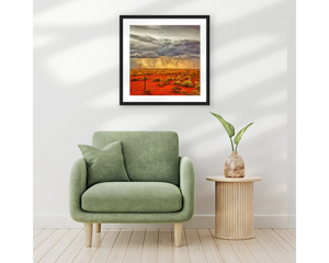 Immerse your space in the raw, untamed beauty of the Australian Outback with Scott's APPROACHING STORM wall art print. This skilfully captured photo displays the essence of the vast and dynamic outback landscape, presenting an awe inspiring moment as a storm approaches on the horizon. The photograph's rich orange red tones mean this visually impressive scene will command attention in any room. Available in various sizes, you can choose the perfect fit for your environment.