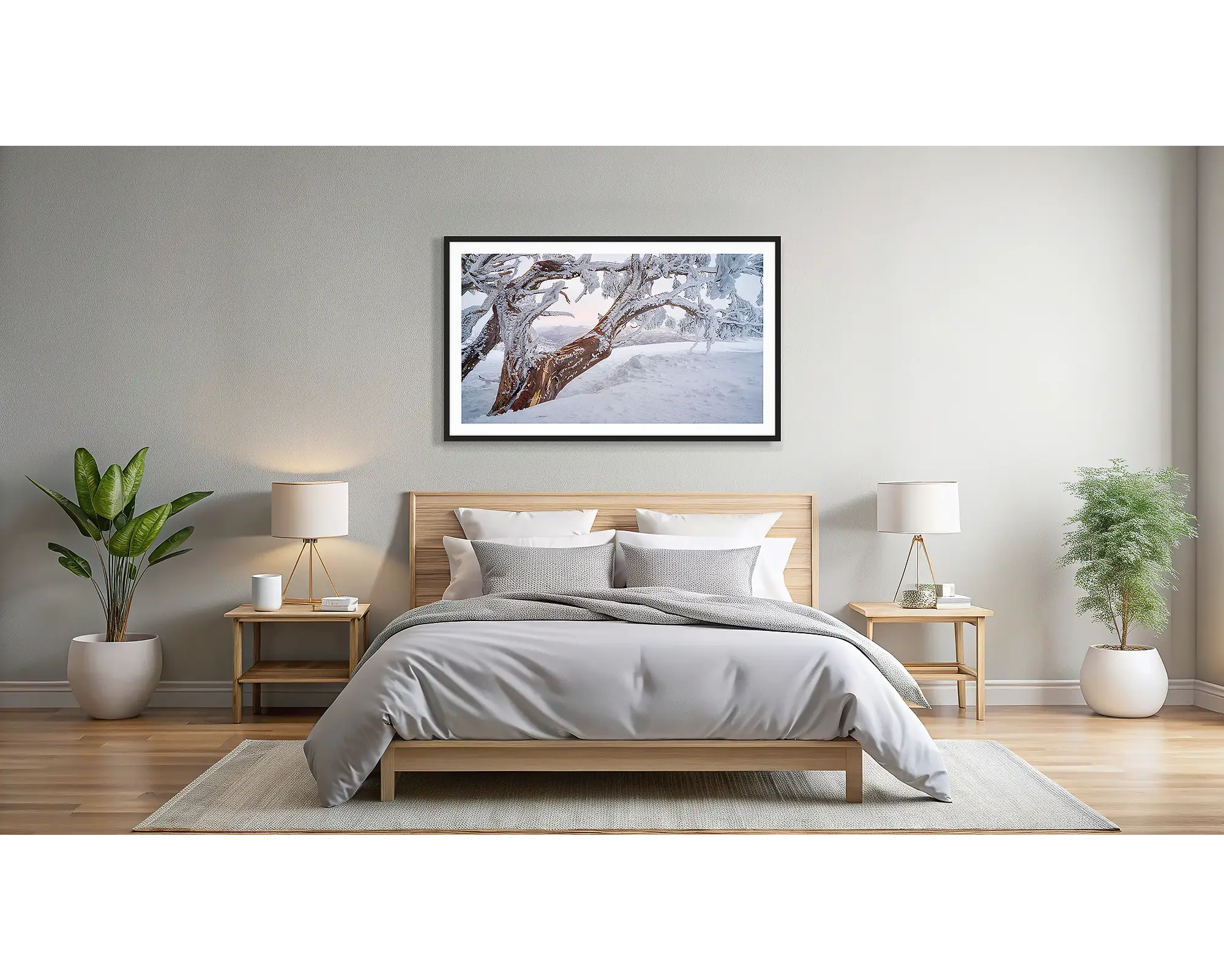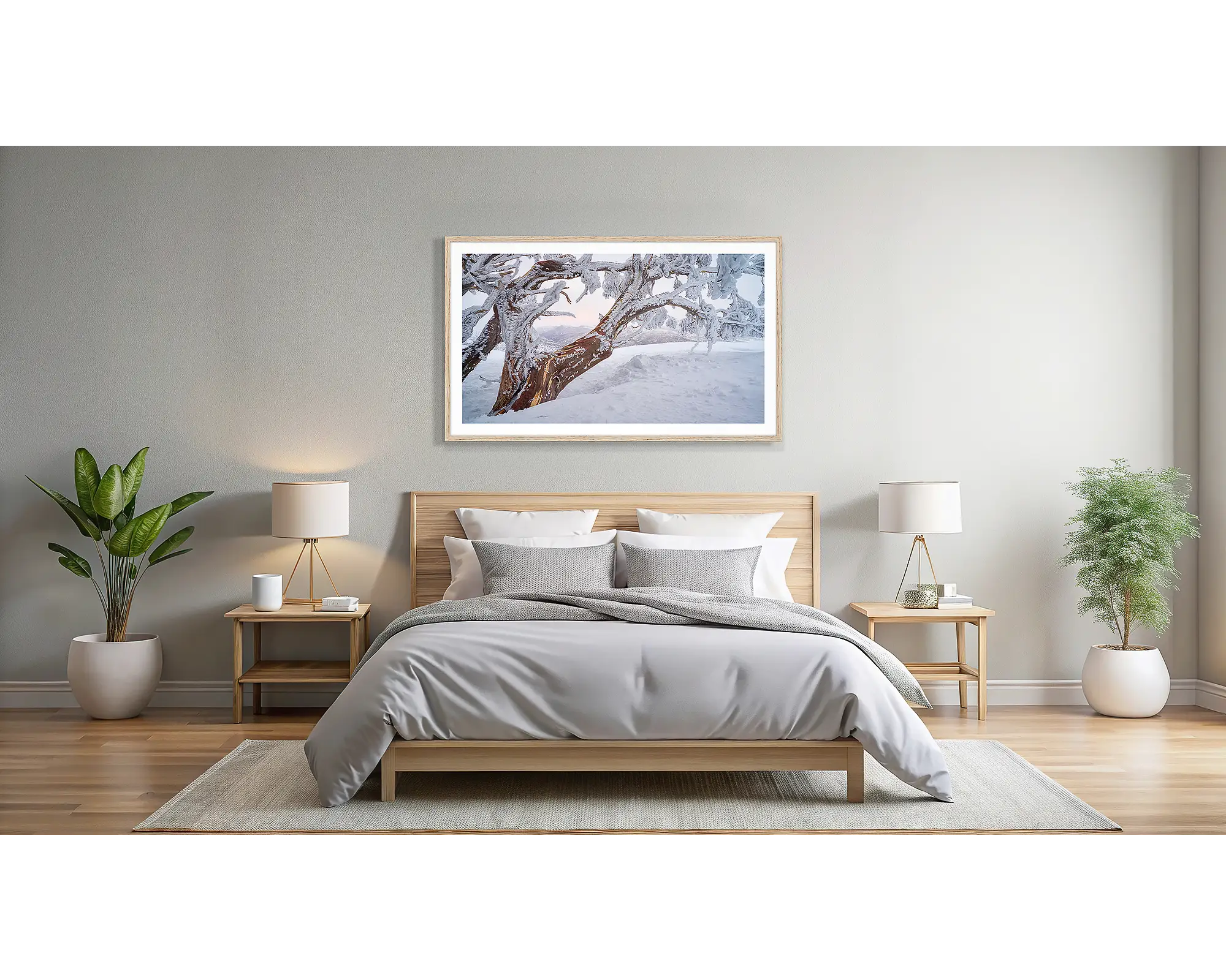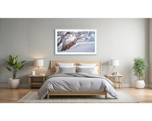 Bring the beauty of the Australian Alps into your space with this stunning snow gum wall art. Captured at the top of the tree line, the snow gum stands surrounded by fresh snow, it's branches coated in ice and glowing under the soft pink hues of sunset. This Australian landscape photograph perfectly captures the stillness and grandeur of snow gums in the high country. Ideal for those who love alpine scenery, this snow gum photography print celebrates one of Australia’s most iconic trees in its purest form.