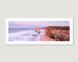 Experience the breathtaking beauty of the Twelve Apostles with this coastal wall art print. Capturing a sunrise at the iconic Twelve Apostles along the Great Ocean Road, the Apostles are bathed in soft morning light. The photo showcases the warm hues of the rocks and cliffs, creating a tranquil and ethereal atmosphere. The gentle play of colours, from soft pinks to deep purples, evokes a sense of calm and natural beauty. Perfect for those who appreciate the awe inspiring wonders of nature, this wall art print brings the magic of dawn into your interior.