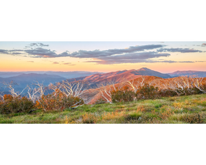 Experience the golden glow of a summer sunset over Mount Feathertop and the Razorback with this artwork by Scott Leggo. The play of light highlights the beauty of the high country landscape, showcasing the hues of the Australian outdoors in all its glory. Ideal for those who cherish summer escapes to the mountains, this piece captures the essence of the alpine experience.