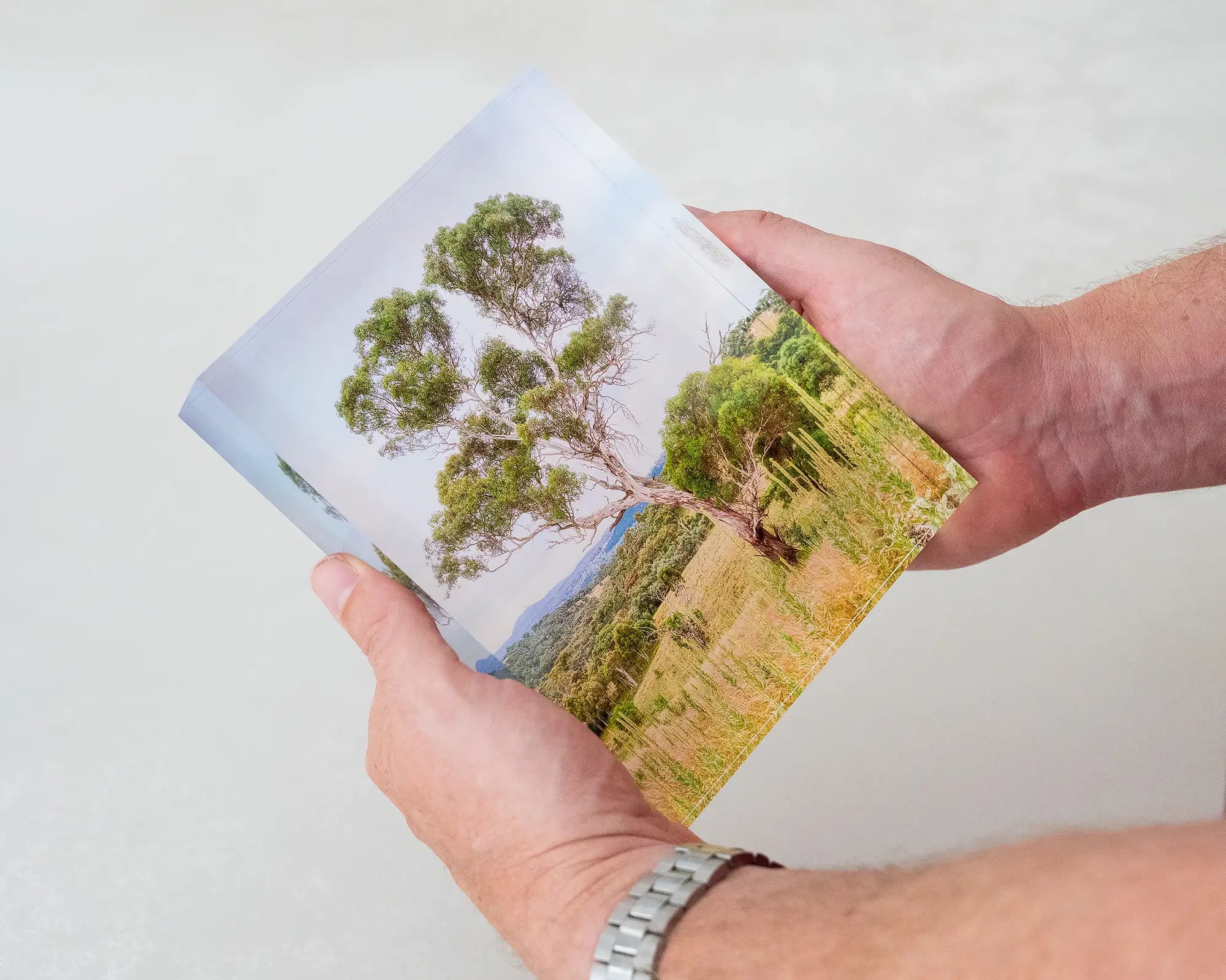 Our acrylic blocks give the photo a three dimensional look. They are perfect for desks, bookshelves, mantlepieces, bed side tables - any horizontal surface.