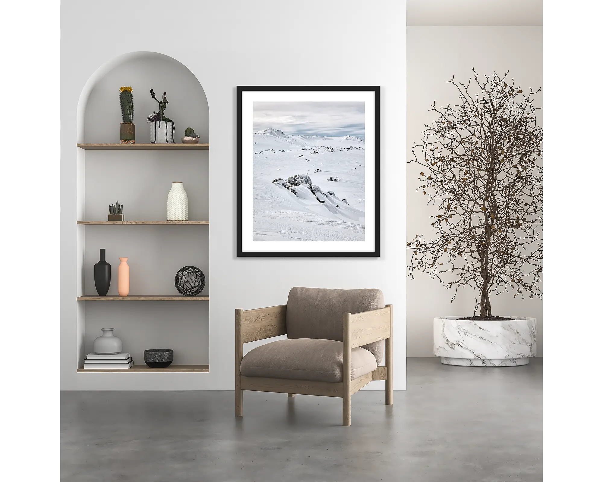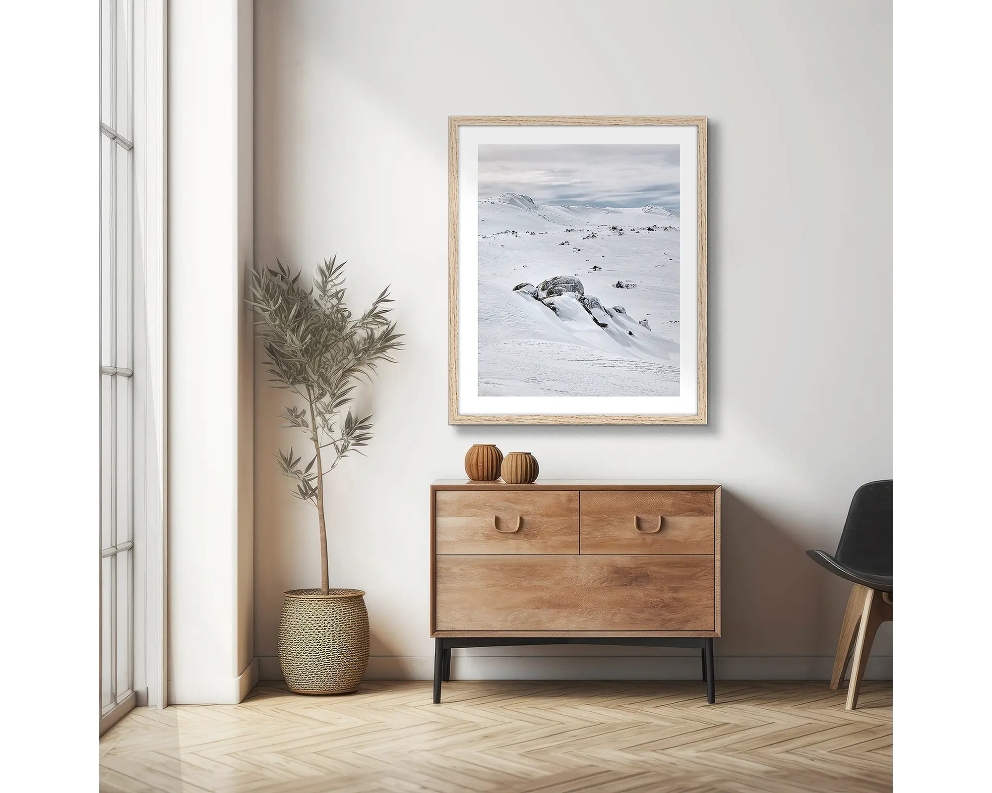 Invite a sense of calmness to your space with the varying shades of white in this alpine wall art print. The mystical mountain landscape provides your interiors a gentle snowy atmosphere, showcasing the impressive Etheridge Ridge in Kosciuszko National Park. Made in Australia to the highest quality, consider a white framed print, arriving ready to hang, adding instant sophistication for your home decor.