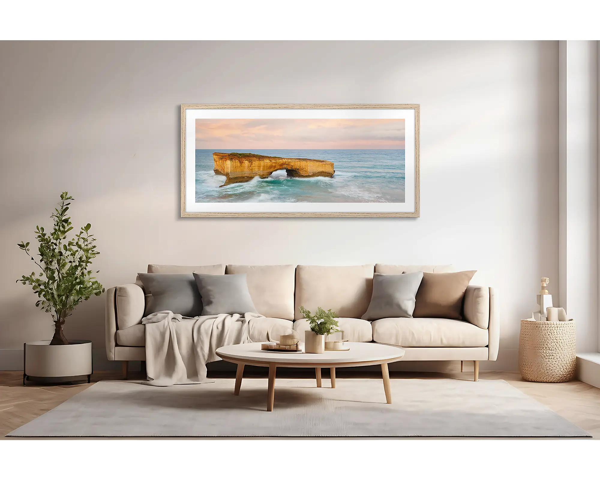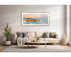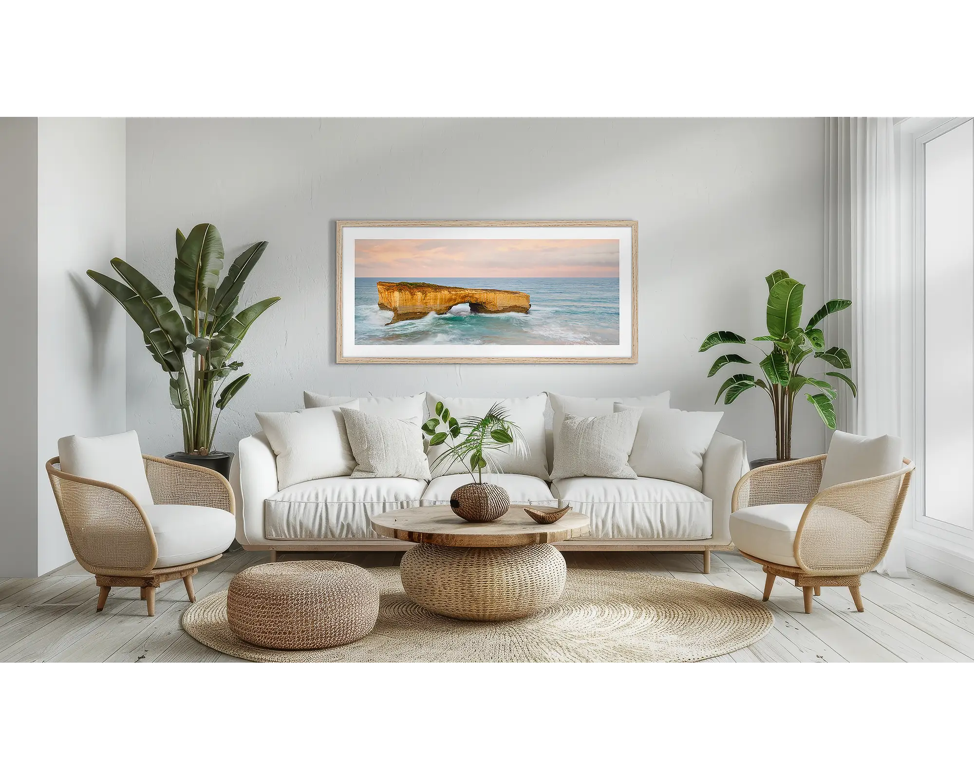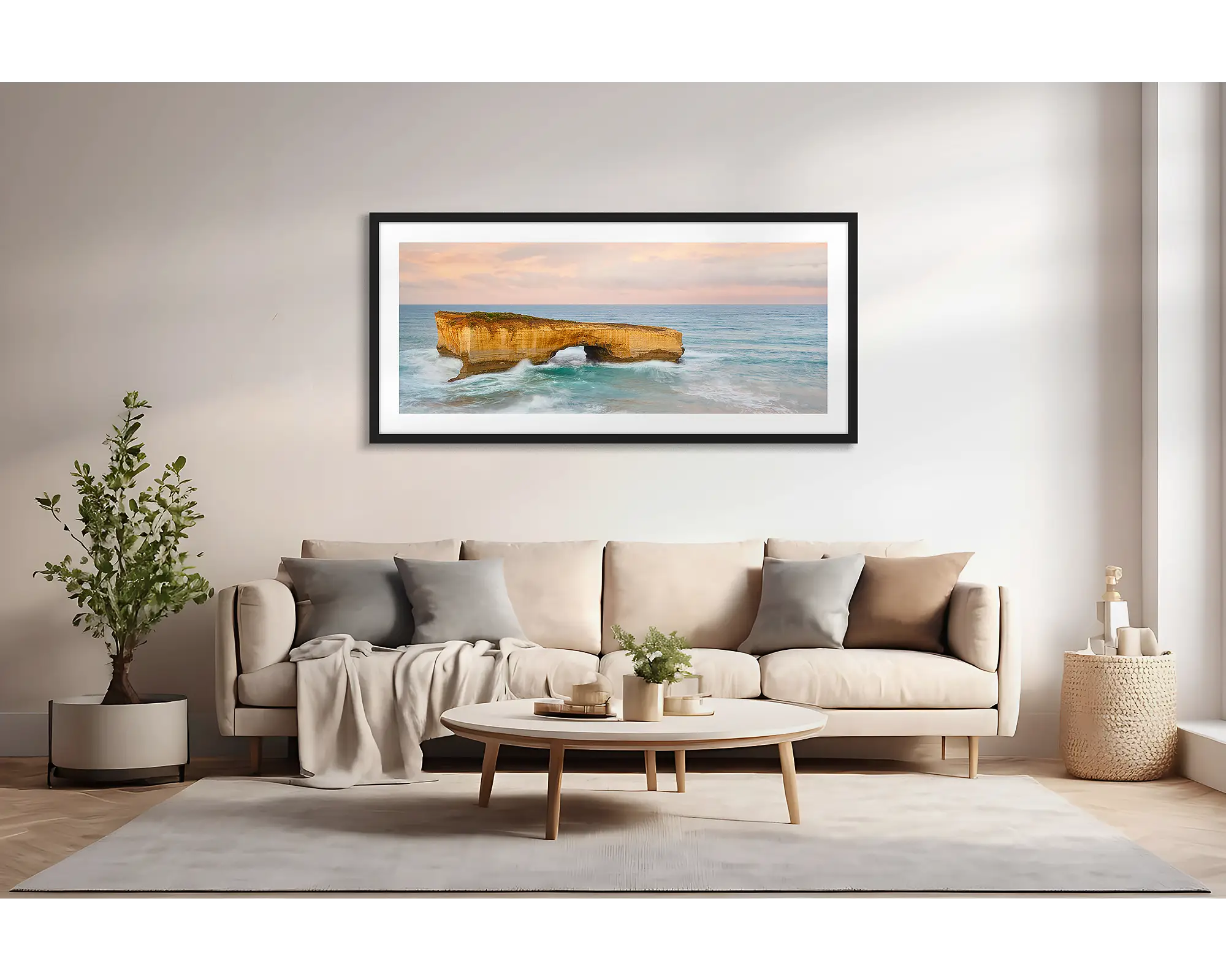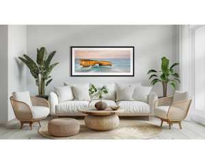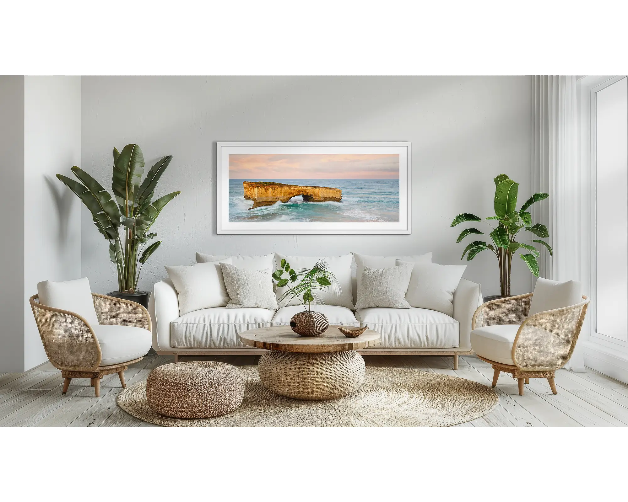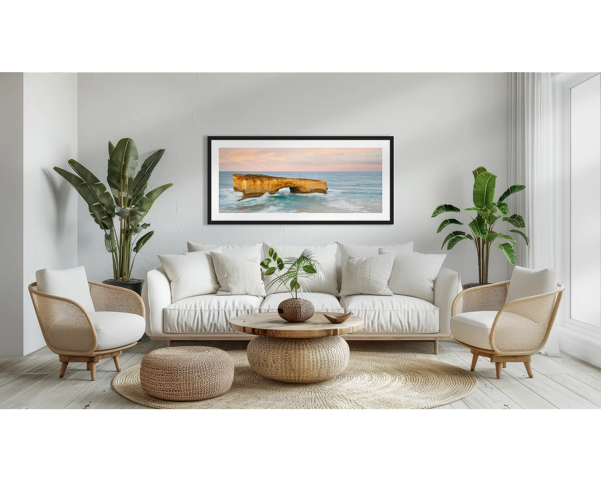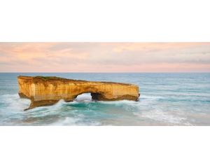 Experience an icon of the Great Ocean Road in your interior with this panoramic wall art print of London Bridge. With its soft sunrise hues, it makes an appealing coastal print suitable for most rooms.