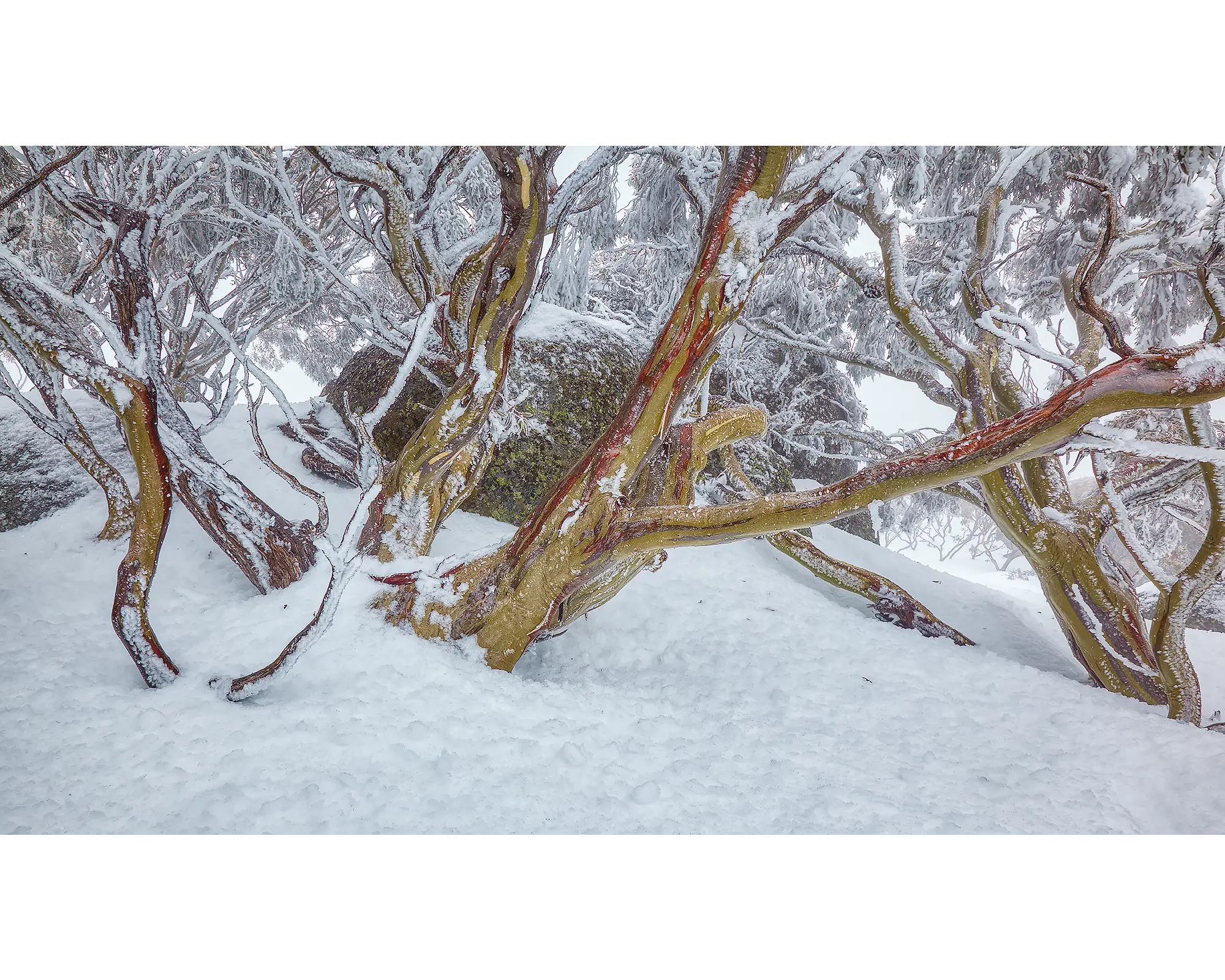 The Ramshead Range extends along a significant portion of the Snowy Mountains. It stretches from near Lake Jindabyne to South Ramshead, marking the Northern Range that forms the Thredbo Valley. The range is generally covered in snow from June through to October and is covered in large parts by snow gum trees. However, during bushfires in 2003 vast swathes of these snow gums were burnt across the range, leaving few remaining trees untouched by fire. Therefore it is special when you find patches of snow gums like this that remain alive and unburnt. They stand as testament to this hardy eucalypt's ability to survive in such challenging alpine environments.