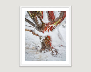 Experience the raw beauty of nature with this striking wall art print featuring a snow gum enduring fierce winds and snow. The vibrant red colours of its bark contrast dramatically against the storm, creating a powerful statement piece that will showcase resilience and natural energy into your space. Ideal for those who appreciate rugged landscapes and bold artistry.