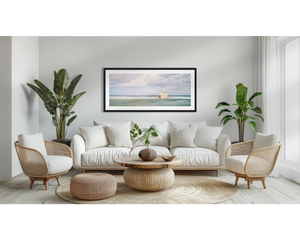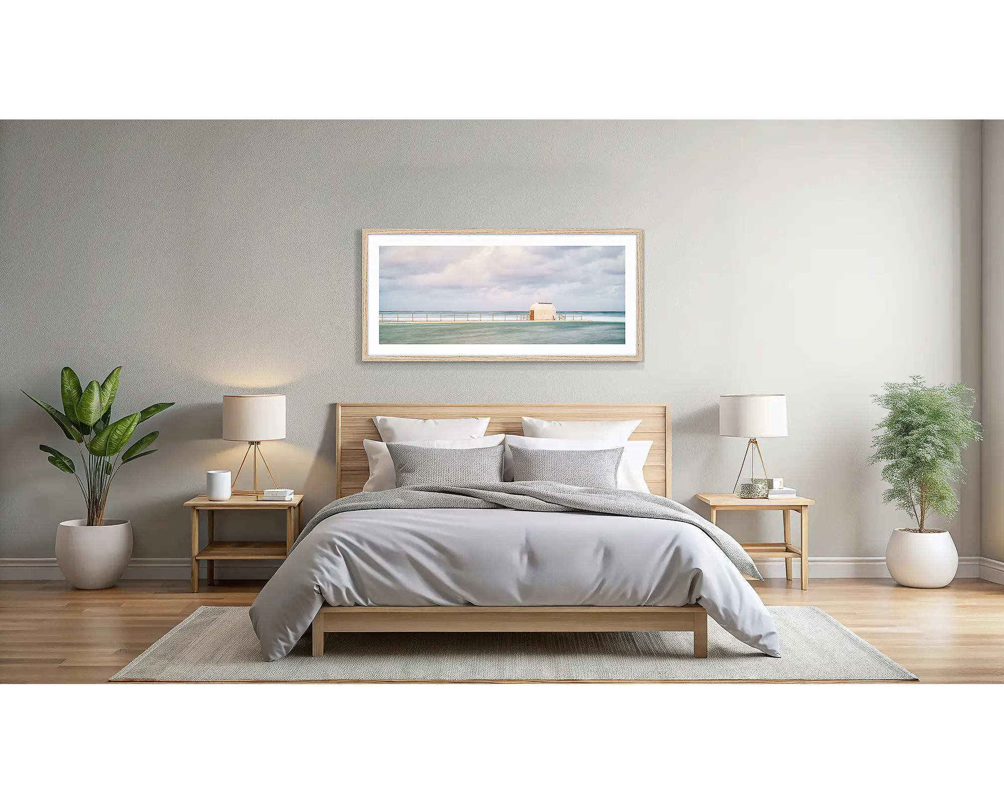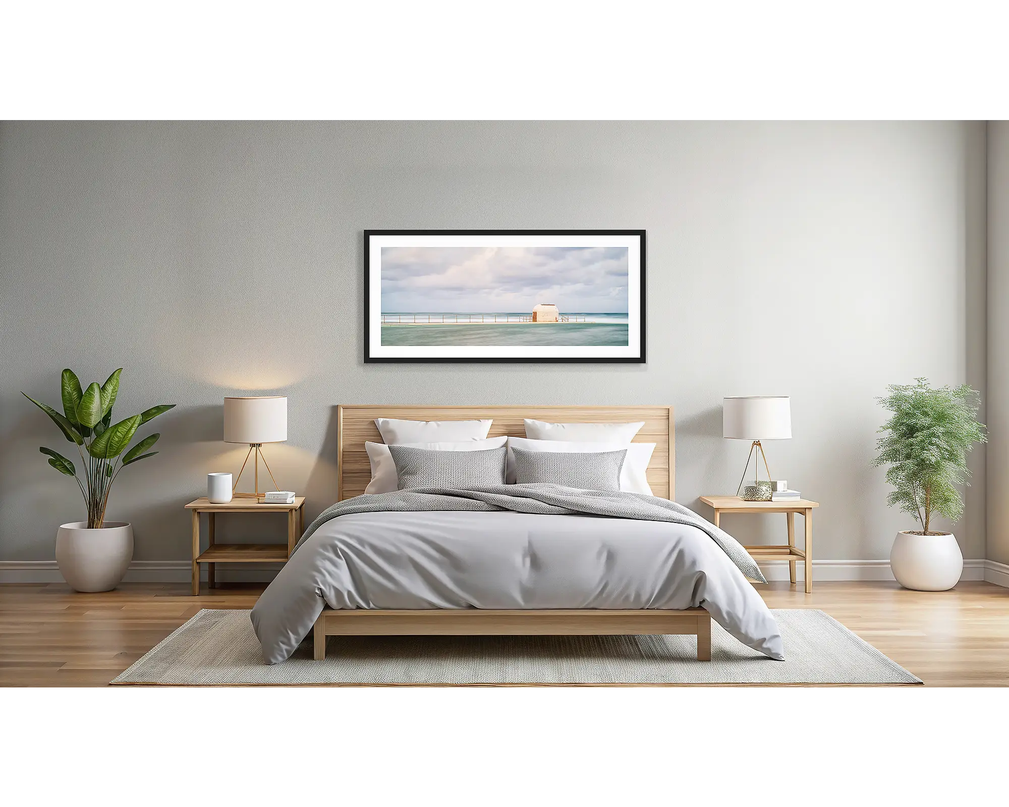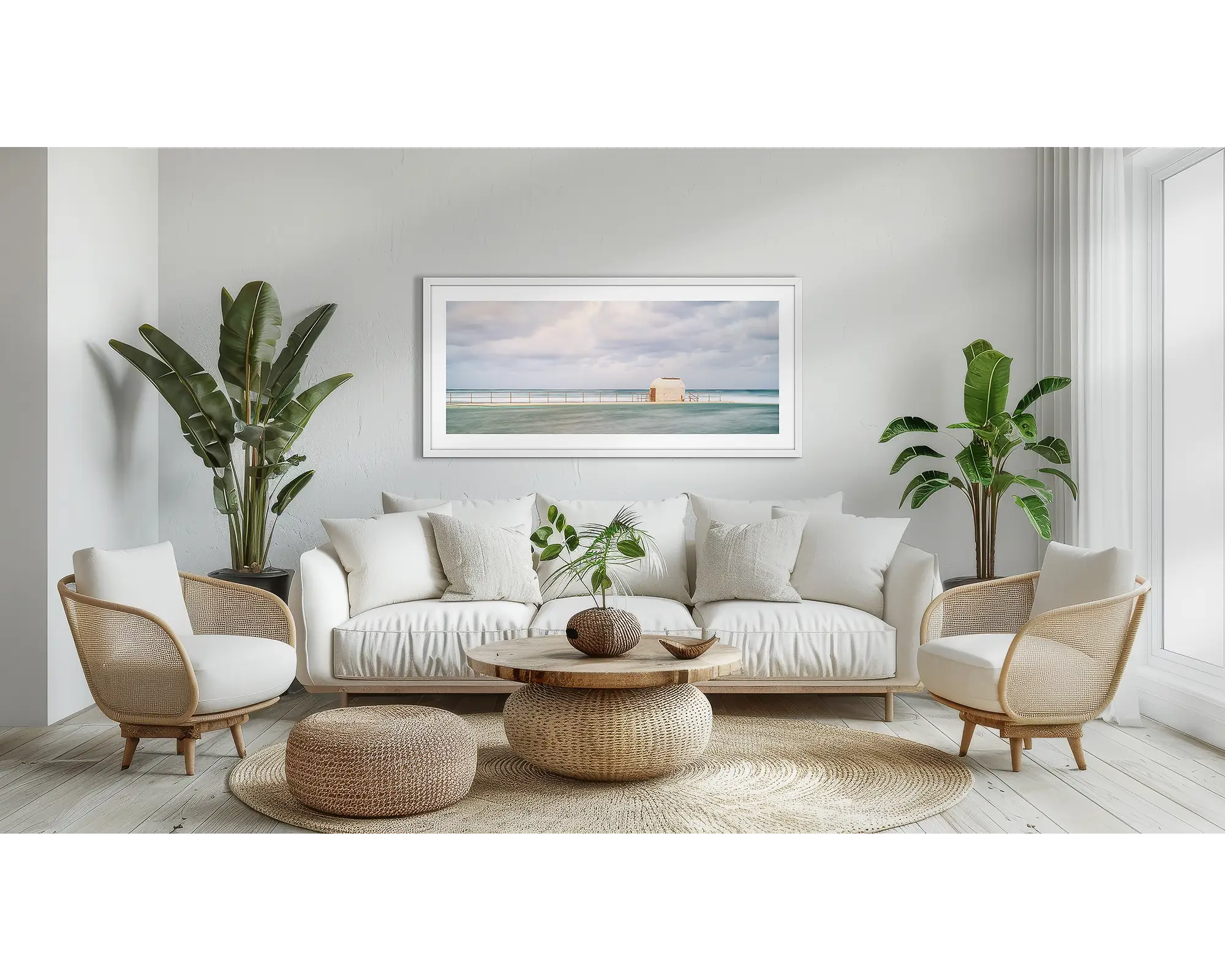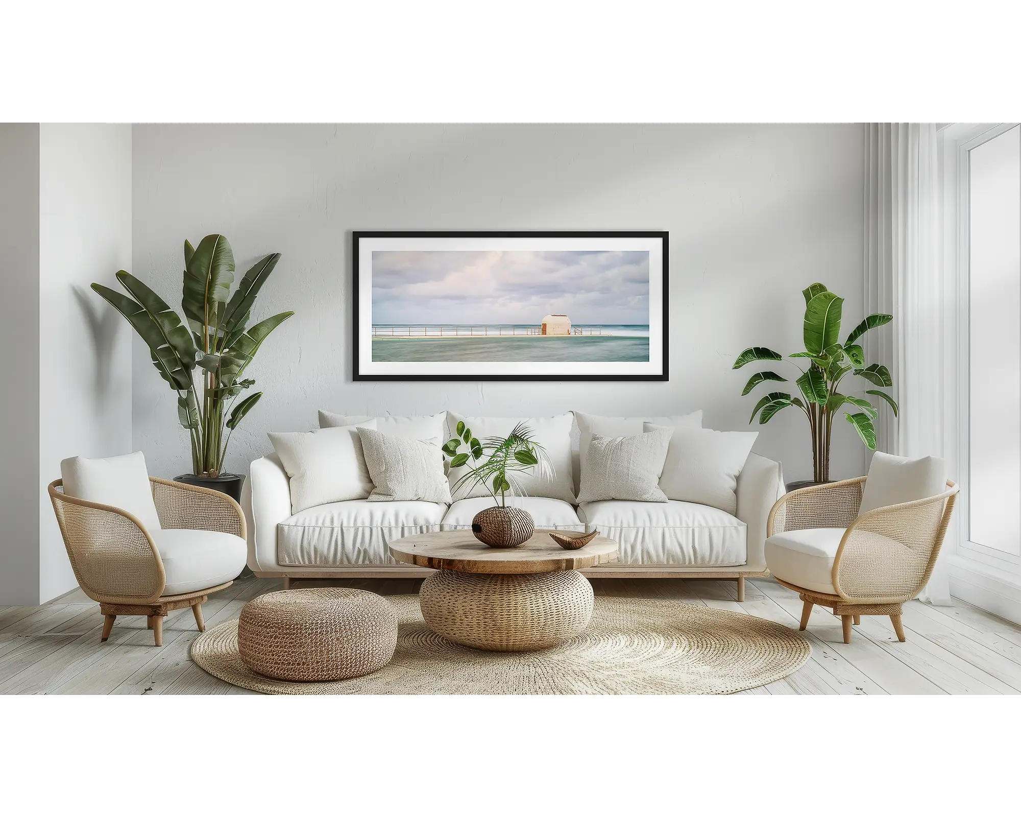 Perfect for adding a touch of serenity and beauty to any room, this wall art print captures the essence of the pumphouse at the Merewether Ocean Baths.