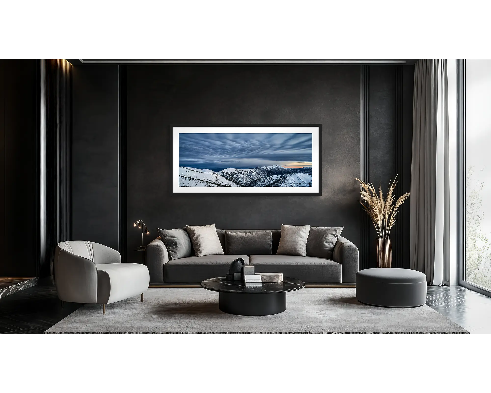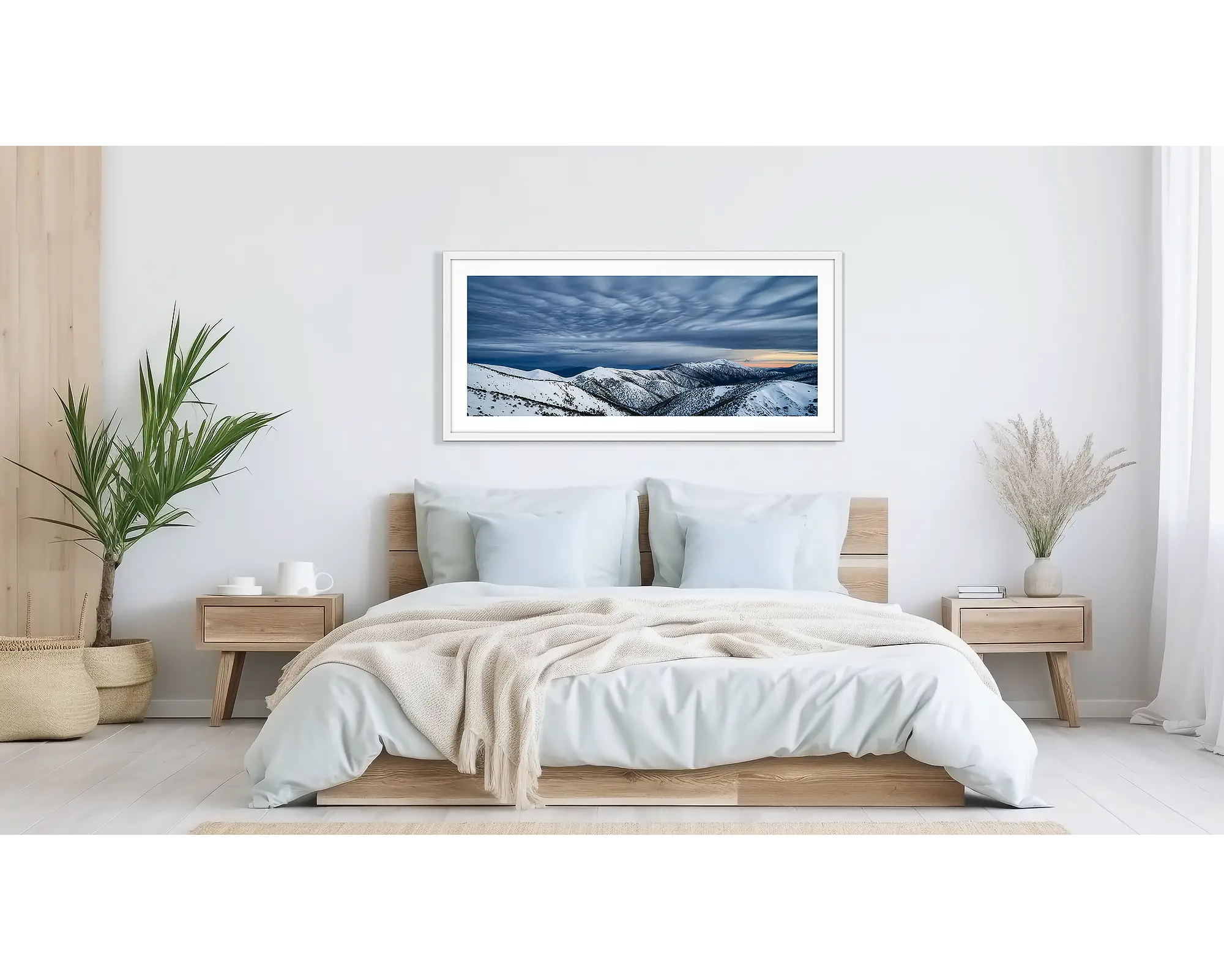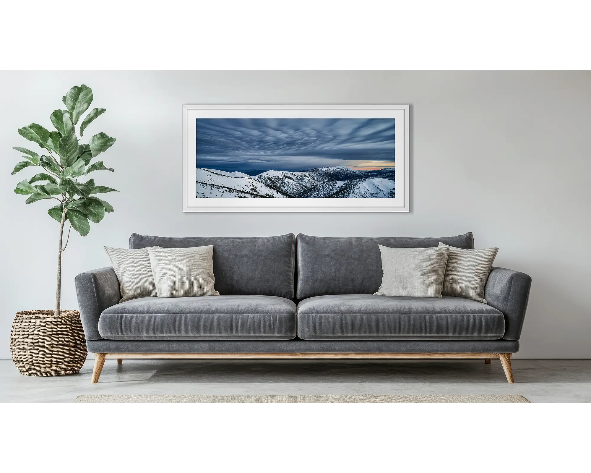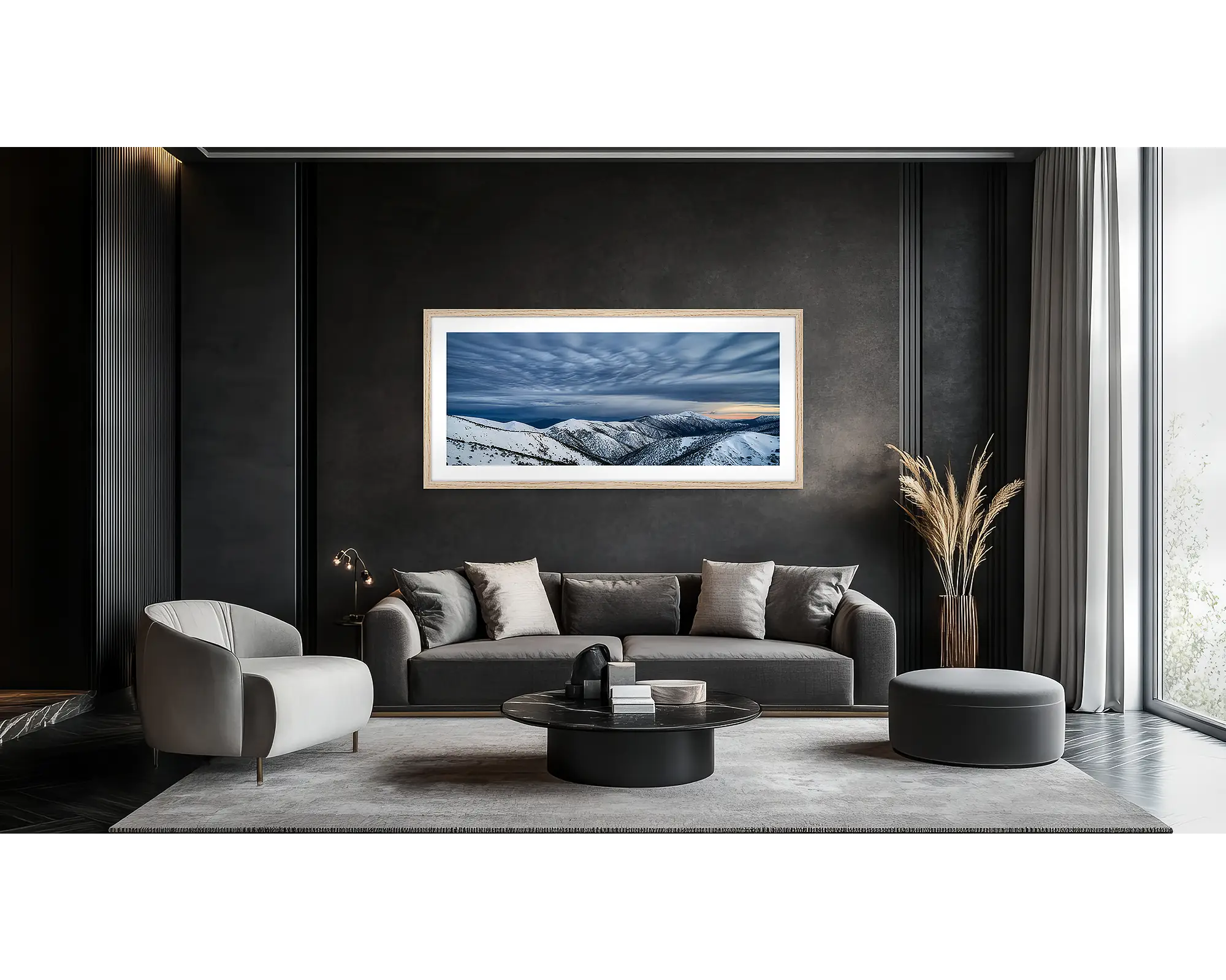 Featuring storm clouds rolling in above Mount Feathertop and The Razorback, this wall art will bring the moodiness of the mountains into your space. Evoking a sense of anticipation and awe in any room, you will experience the dramatic allure of the Victorian alps. Perfect for those who love the area around Mount Hotham or if you're simply seeking to infuse your home with dynamic energy and natural drama. Available in multiple sizes this wall art will add a striking focal point to any room.