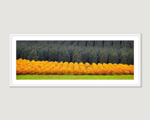 This striking wall art captures rows of trees adorned in vibrant orange hues, showcasing the beauty of the Victoria's Alpine Shire. The bold colours and geometric patterns created by the rows of trees add a dynamic and eye catching element to any interior space, infusing it with warmth and energy.