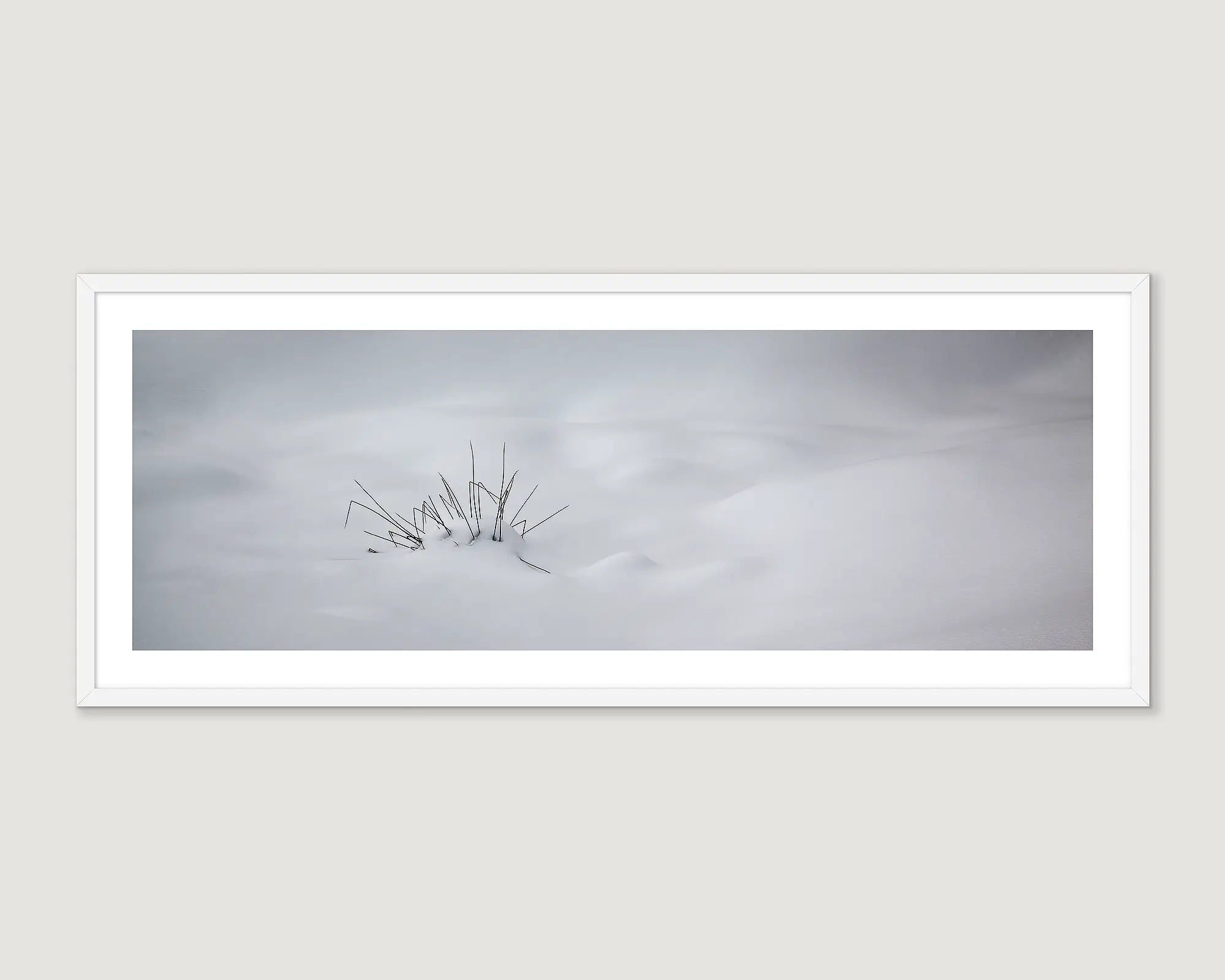 Enhance your space with the minimalist charm of SHAPES OF WINTER. This captivating photo features alpine vegetation delicately buried in snow, perfect for complementing a Scandi-style interior aesthetic. The soft, delicate shapes within the snow will add interest and tranquility to your walls, creating a serene ambiance in any room.