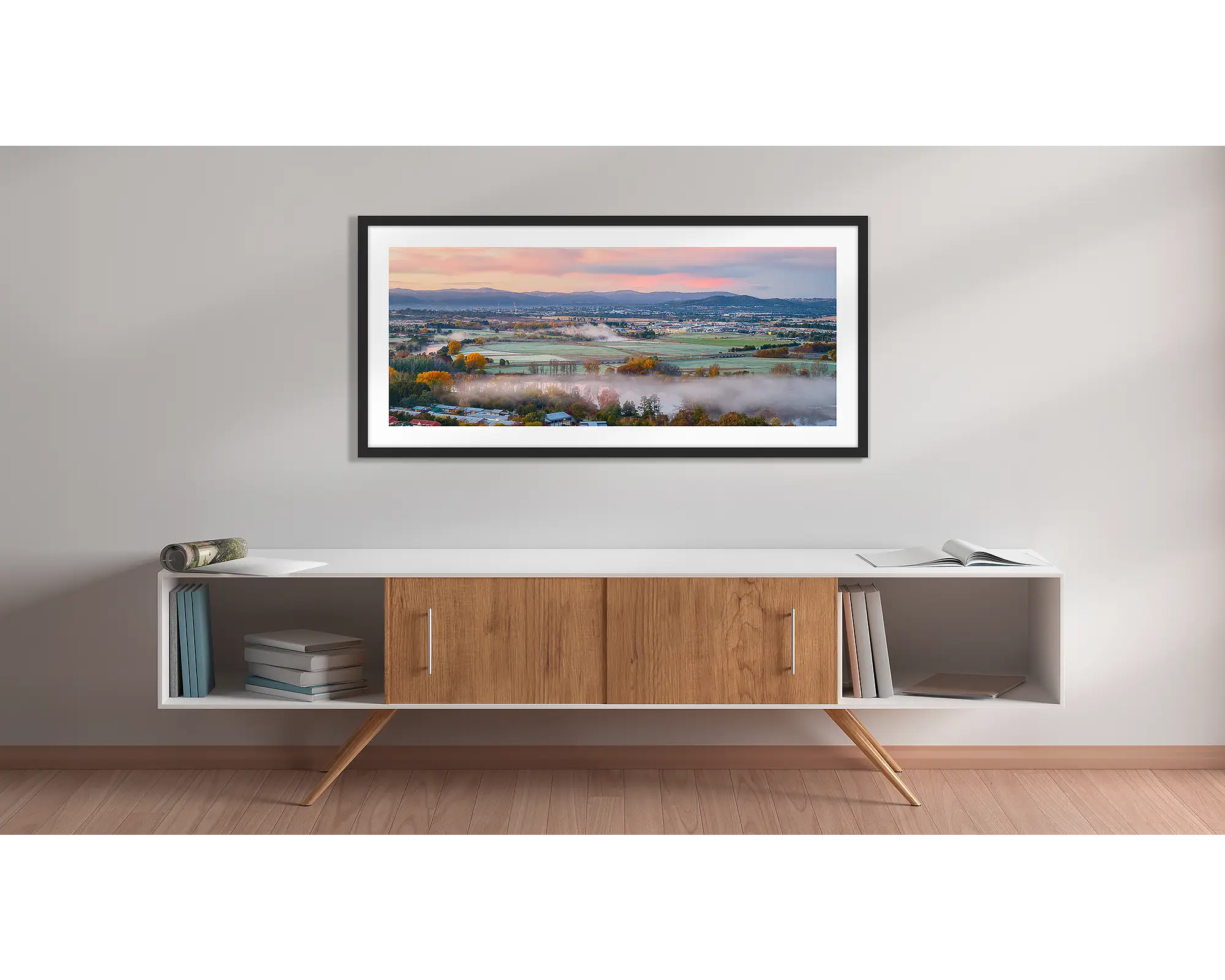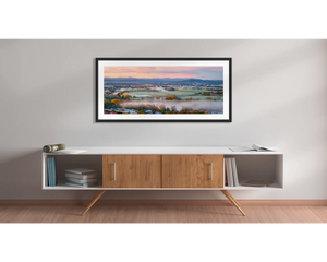 Experience the beauty of a foggy Canberra sunrise with Scott's CANTURF wall art print. This panoramic print captures a serene scene overlooking Canturf's farm, Fyshwick and Queanbeyan, making it a great addition if you or your business has a connection to this part of the Canberra region.