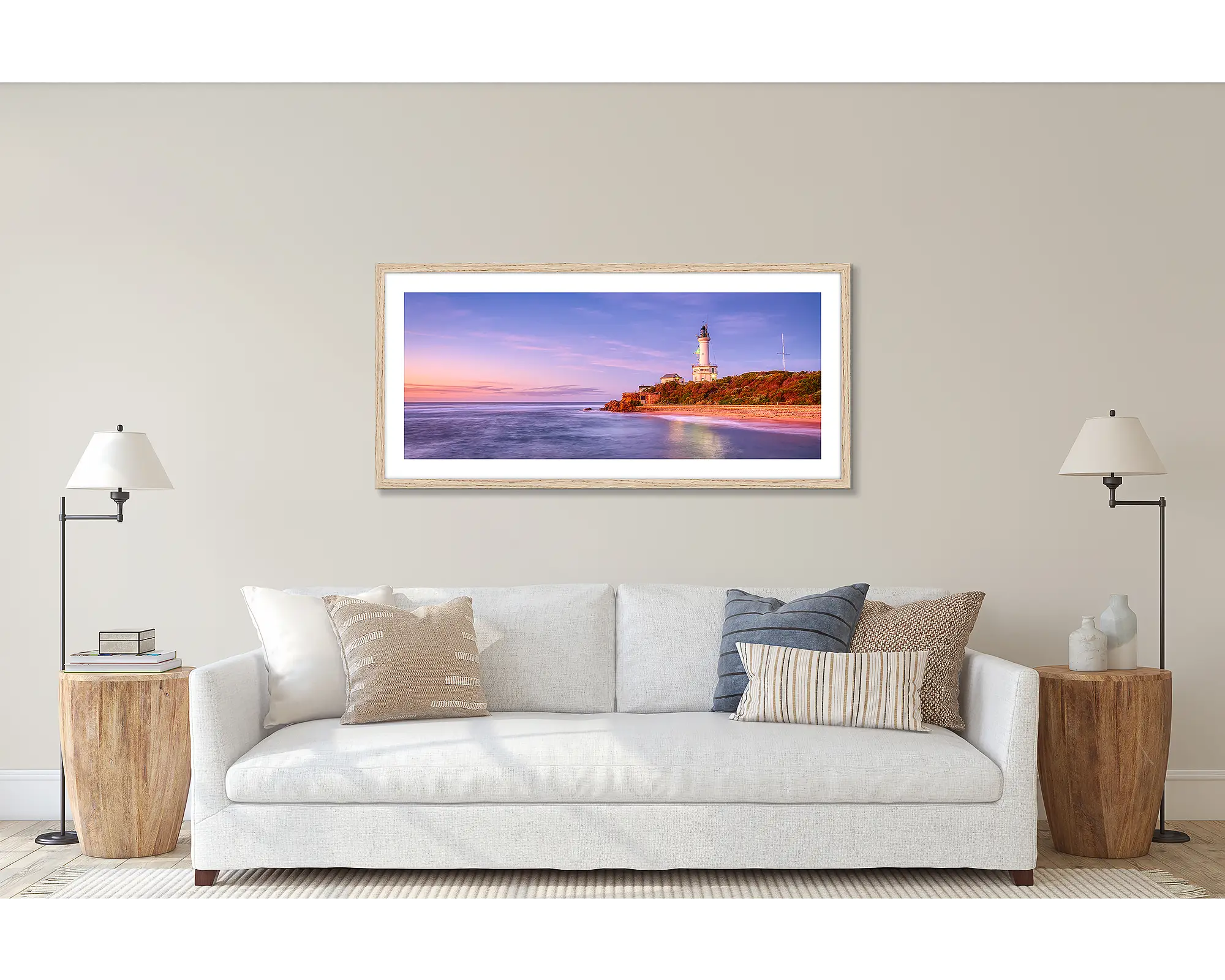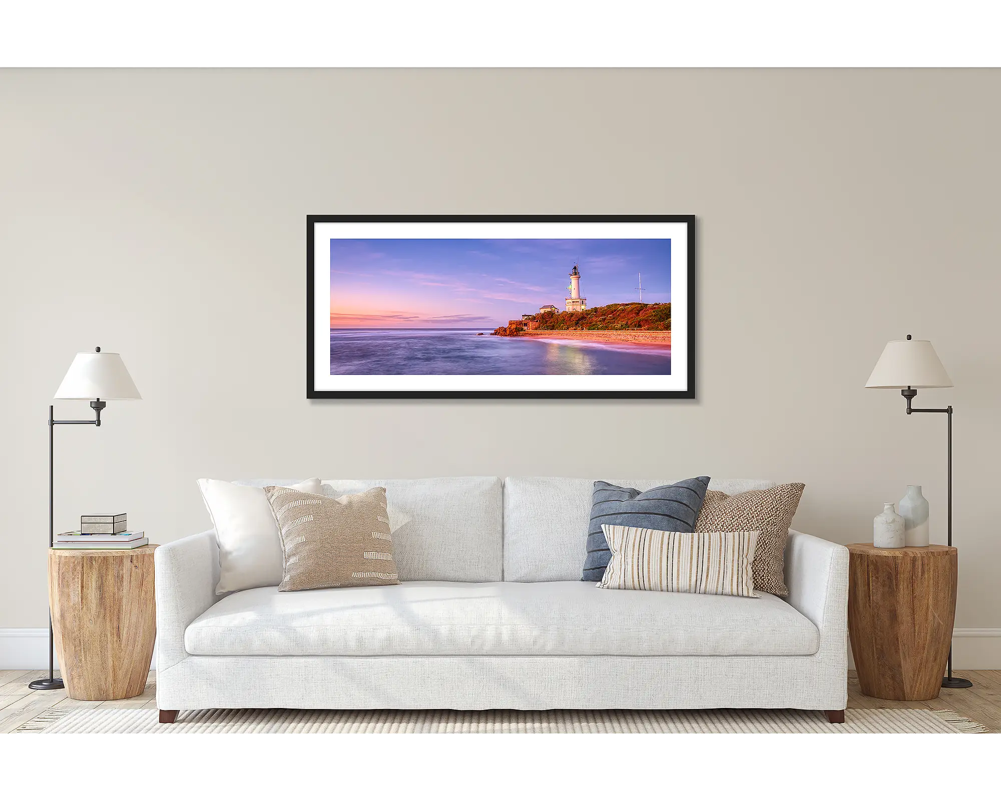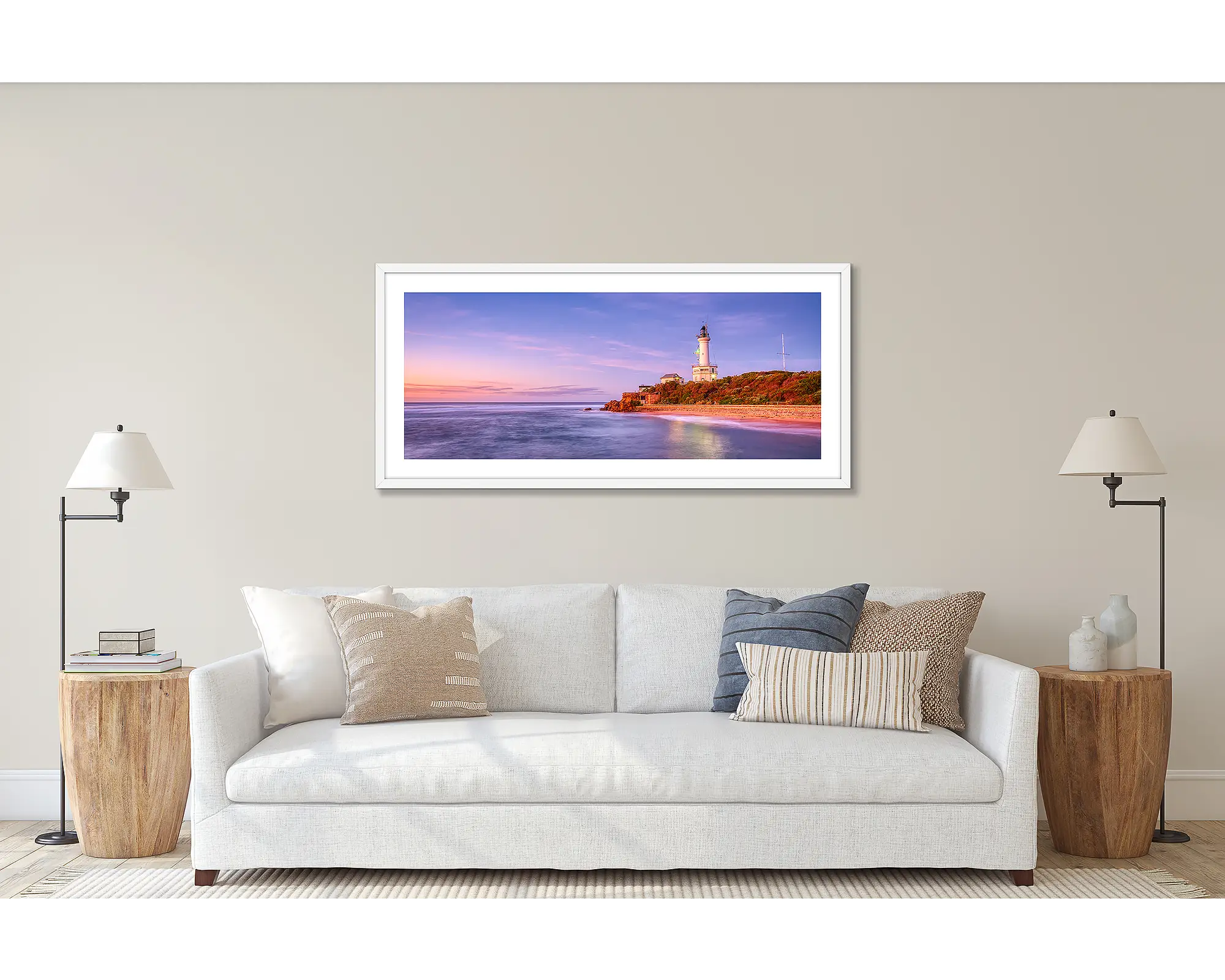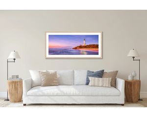 Illuminate your space with the soft, ethereal glow of sunrise captured in this mesmerising coastal wall art featuring Point Lonsdale Lighthouse. The gentle purple hues will delicately infuse warmth and tranquility into any room, creating a serene ambiance that invites relaxation and contemplation.