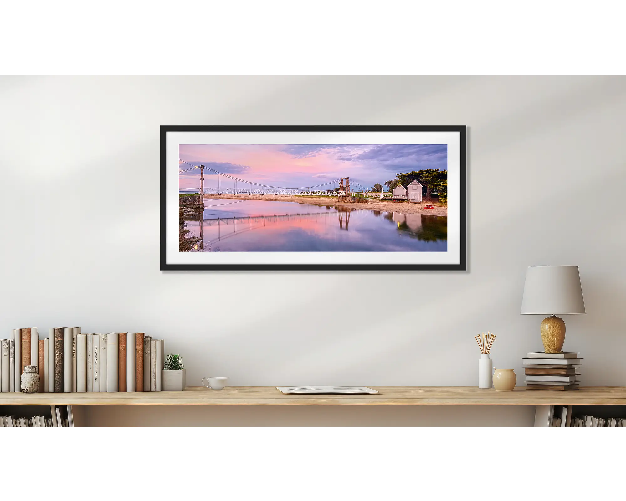 Capture the charm of the seaside with this stunning Australian wall art. The picturesque swing bridge set against the backdrop of pink sunset clouds makes it the perfect choice for anyone seeking wall art with a coastal theme that adds a touch of romance to their space.