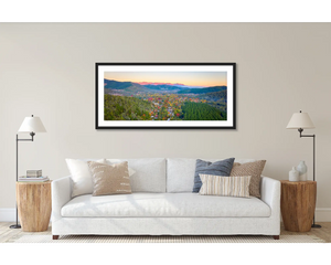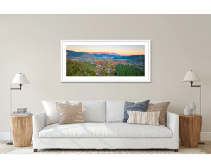Experience the beauty of Bright in autumn with Scott's WELCOME TO BRIGHT wall art print. This stunning panoramic artwork captures the autumn colours of this town with the spectacular Mount Buffalo lit up at sunrise in the background. The perfect artwork for anyone who has a connection to this part of Victoria.