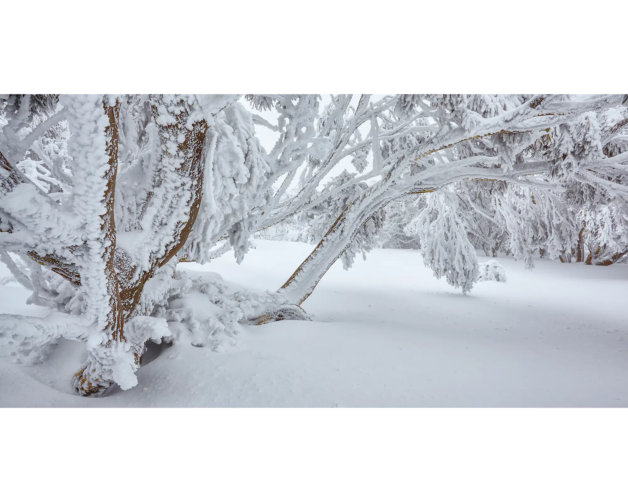 The Australian Alps Walking Track winds through the High Country of Victoria, New South Wales and the ACT. It traverses rugged and remote alpine country, passing through some of Australia's finest alpine national parks. The track climbs Australia's highest mountains, crossing exposed high plains, passes through magnificent tall forests and stunted snow gum woodlands and discovers sites rich in history. In winter, much of the higher reaches of the walking track are buried in snow. On this occasion, my afternoon on the track was spent in heavy fog, with constant snow falls and poor visibility. When the weather finally lifted a little for me to see more of what was before me, this was one of the first scenes that drew me in. Here, buried in snow, the walking track passed adjacent to snow and ice covered snow gums. It really was a winter wonderland.
