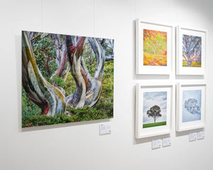 Experience the unique and graceful curves of snow gums on a wall in your home or workplace with Scott's CURVES wall art print. If you're looking to bring a piece of the Australian alps into your space, then this is a perfect addition. The textured tree trunks, highlighted by a subtle play of cool colours, create a natural interplay perfect for both traditional and more modern interior designs.
