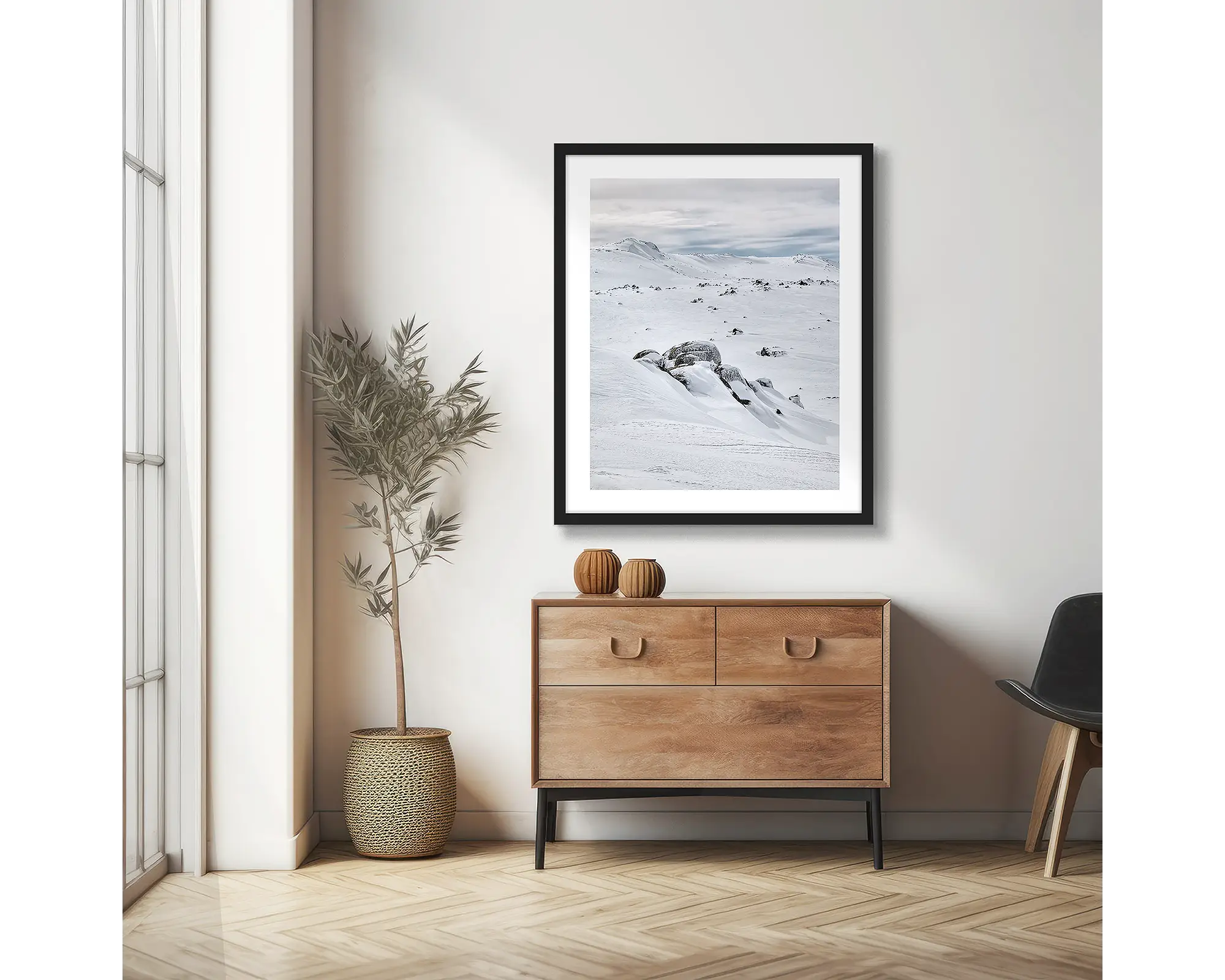 Invite a sense of calmness to your space with the varying shades of white in this alpine wall art print. The mystical mountain landscape provides your interiors a gentle snowy atmosphere, showcasing the impressive Etheridge Ridge in Kosciuszko National Park. Made in Australia to the highest quality, consider a white framed print, arriving ready to hang, adding instant sophistication for your home decor.