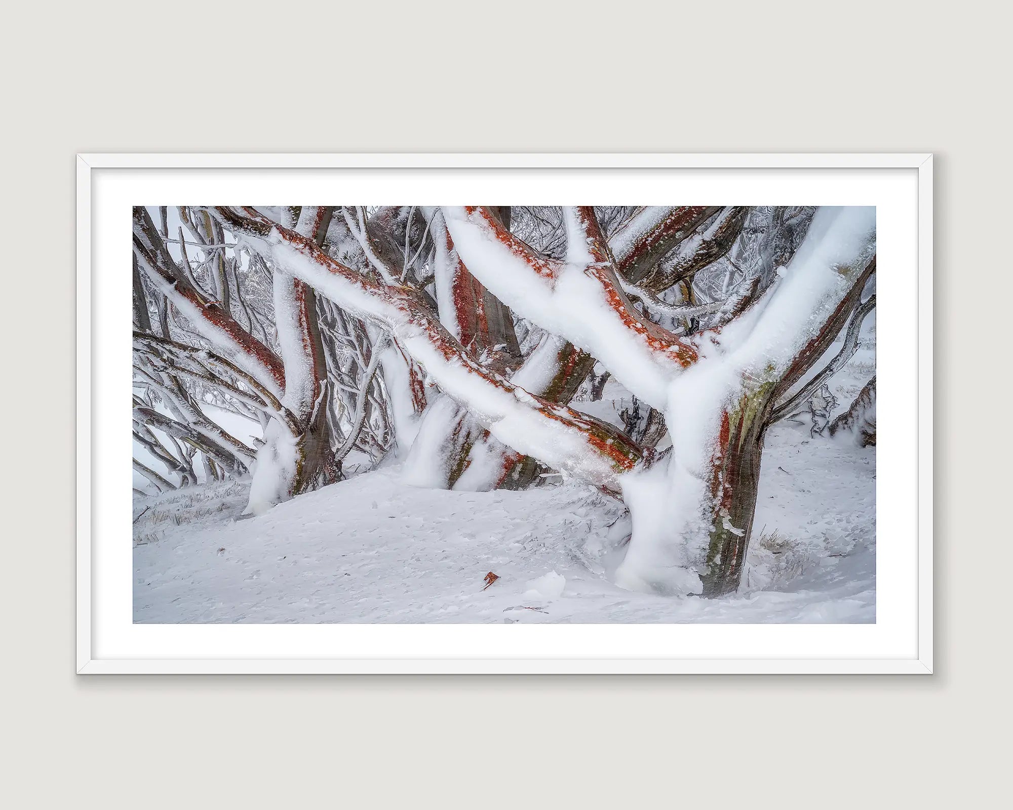 Share your love of winter and Australian snow gums in your home with this wall art print that captures these trees amongst their winter home. Order now with free delivery Australia wide.