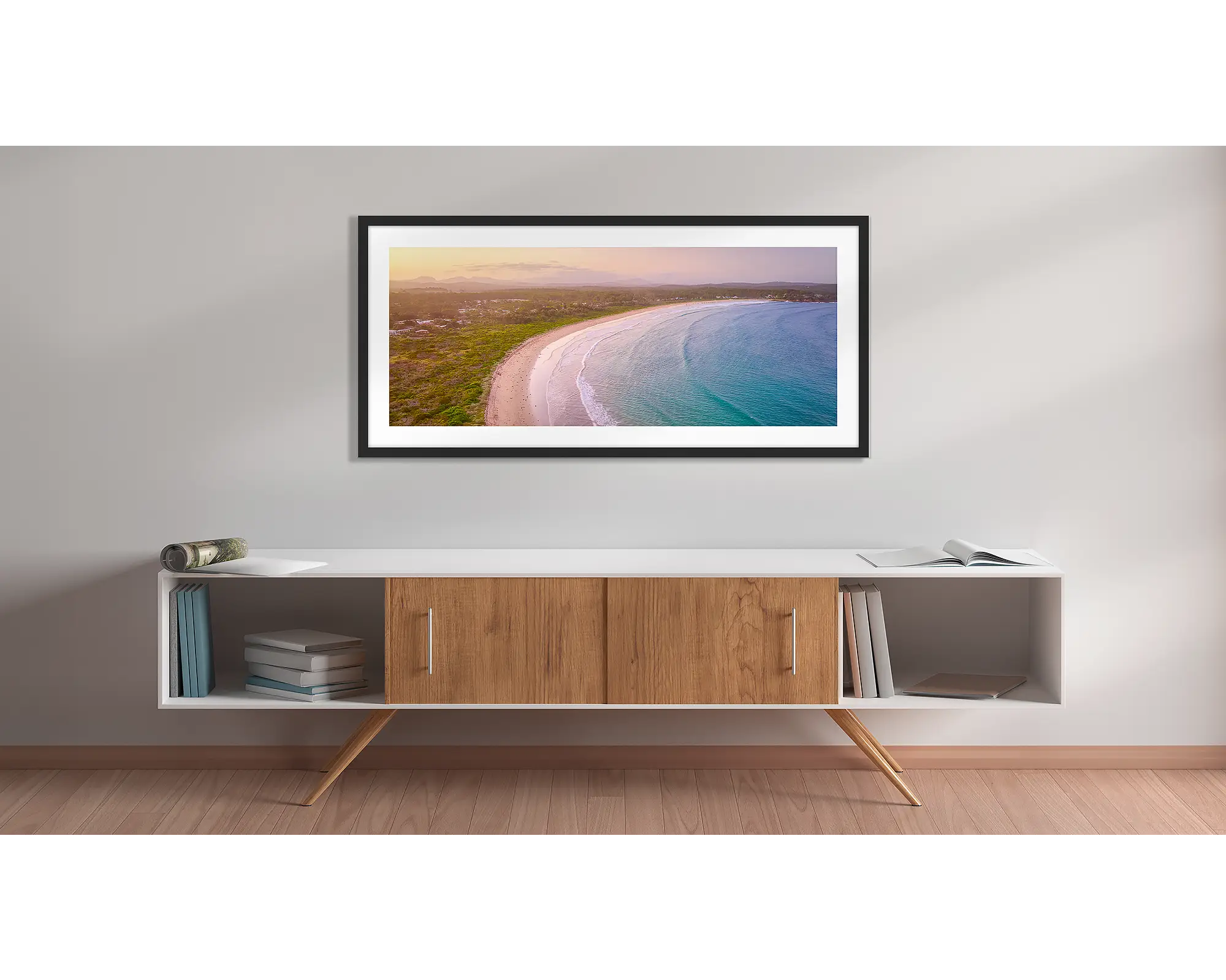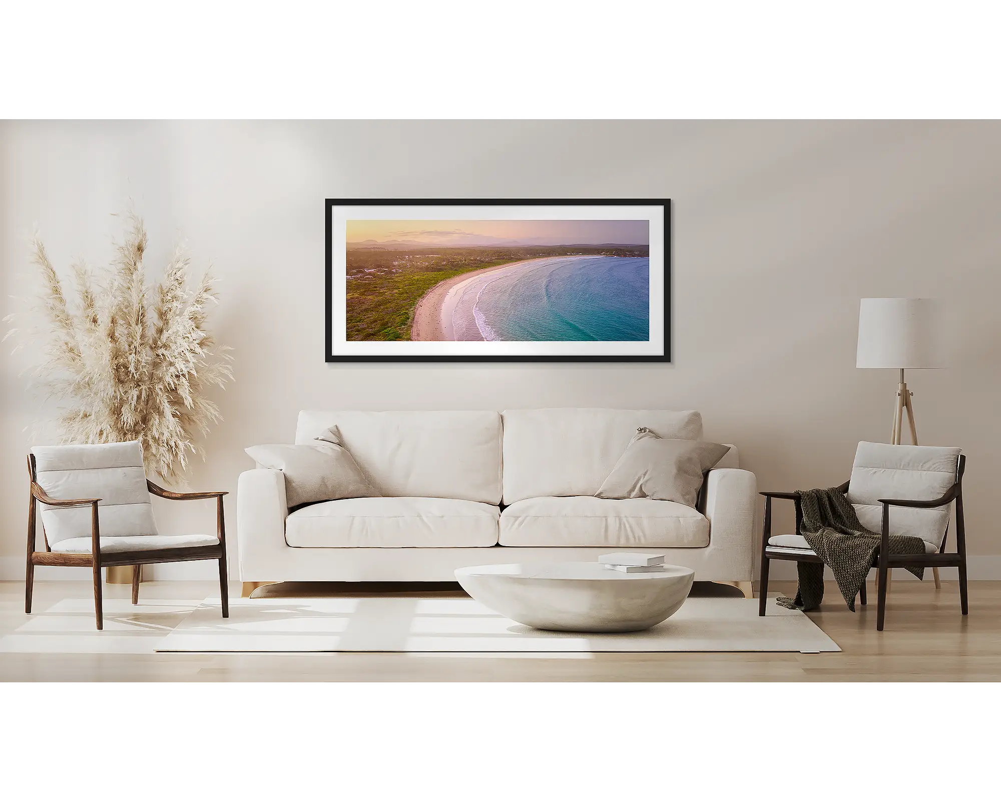 //www.scottleggo.com/cdn/shop/files/curvature-wall-art-print-with-black-frame-of-sunset-over-broulee-beach-south-coast-hung-above-couch.webp?v=1759293349 1.25