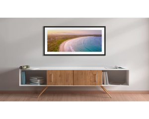 Relive summer days at the South Coast with this CURVATURE wall art print. Featuring sunset colours projecting across the coast, this panoramic print will add a pop of colour and beachy charm. Perfect for lovers of the South Coast.