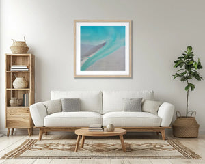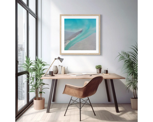 Immerse yourself in the mesmerising beauty of The Kimberley with this aerial photography wall art print. ENTRY captures a unique perspective of water returning to the ocean, depicted in abstract form. The bright aqua of the water contrasts beautifully with the sand, creating a striking visual composition. Made in Australia with premium quality materials, this artwork will bring the allure of the Kimberley's coastal landscape into your home.