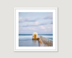Enhance your living space with this GOLDEN DOOR wall art print, featuring a view of the Merewether Ocean Baths pumphouse after sunset. Perfect for Novocastrians, this square artwork will bring a touch of coastal tranquility to any room.
