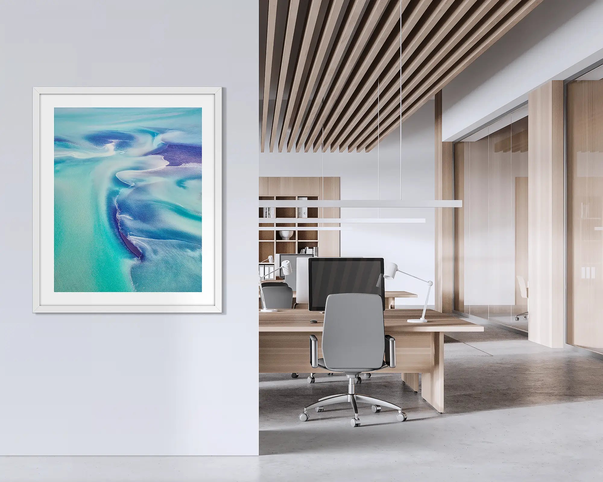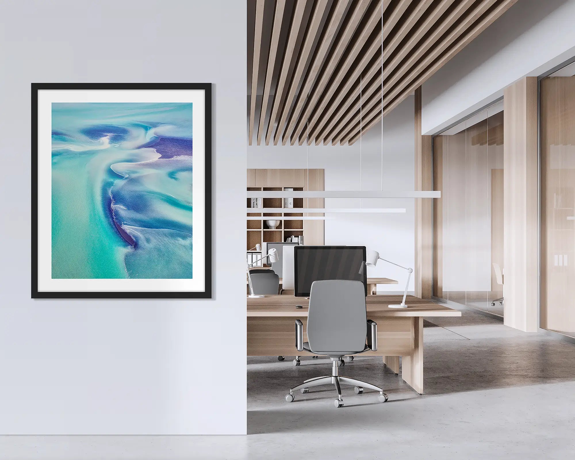 //www.scottleggo.com/cdn/shop/files/permeate-framed-abstract-kimberley-wall-art-with-timber-frame-hung-on-office-wall.webp?v=1764728419 1.25