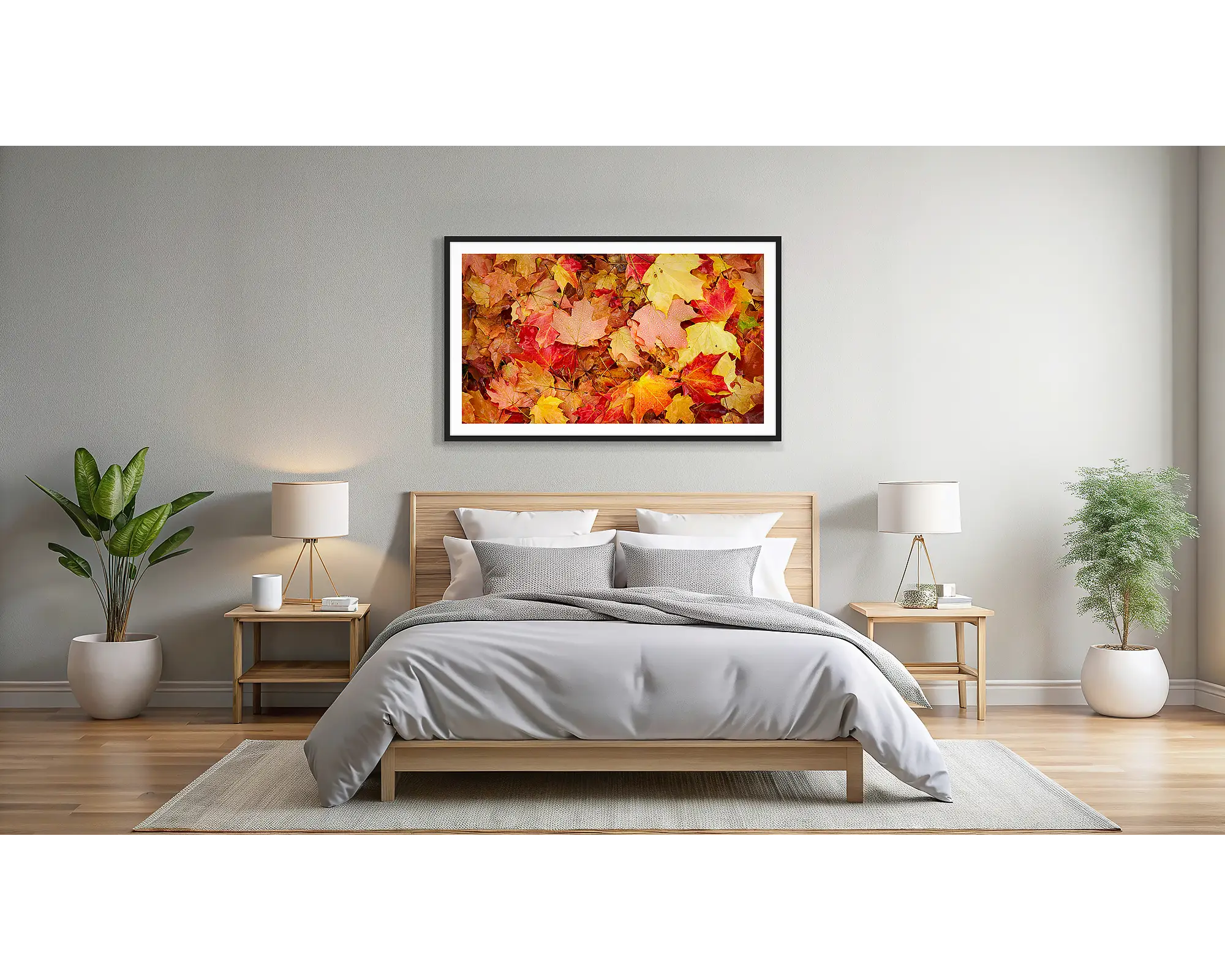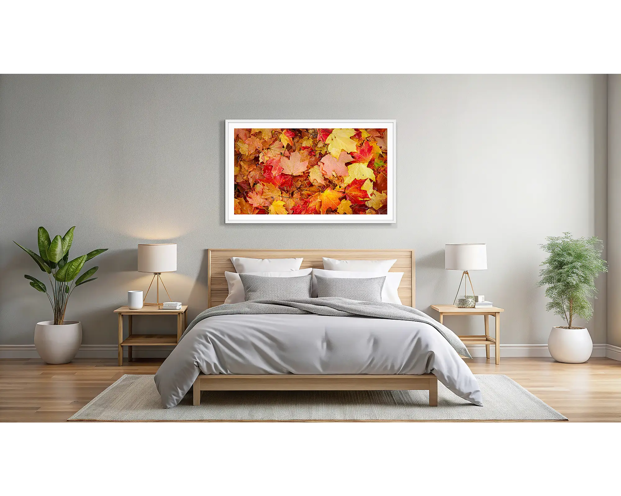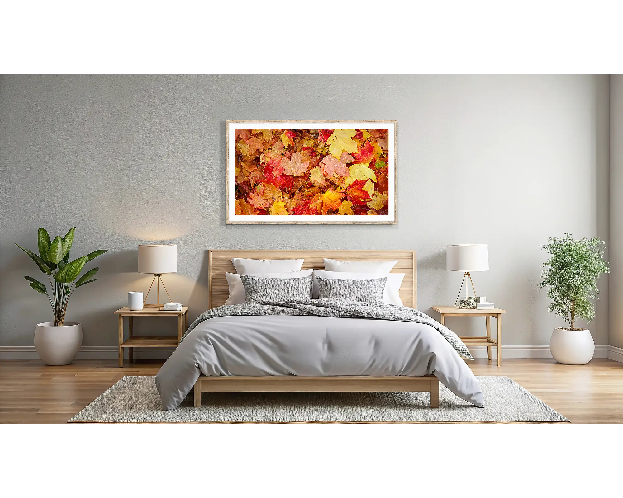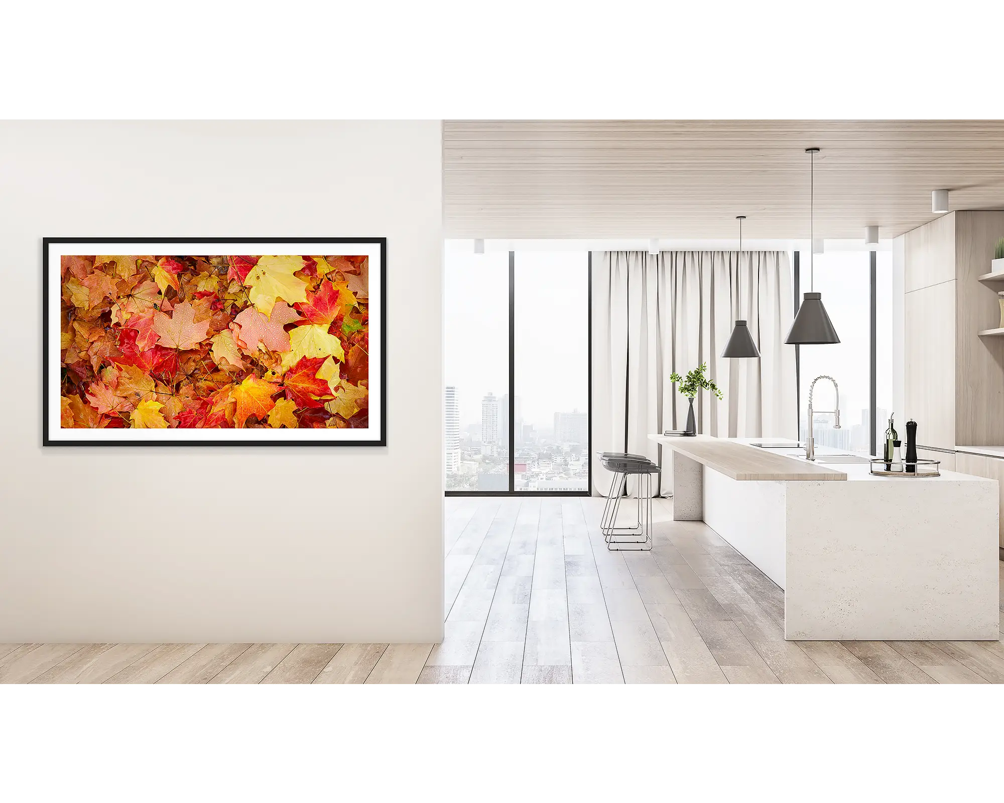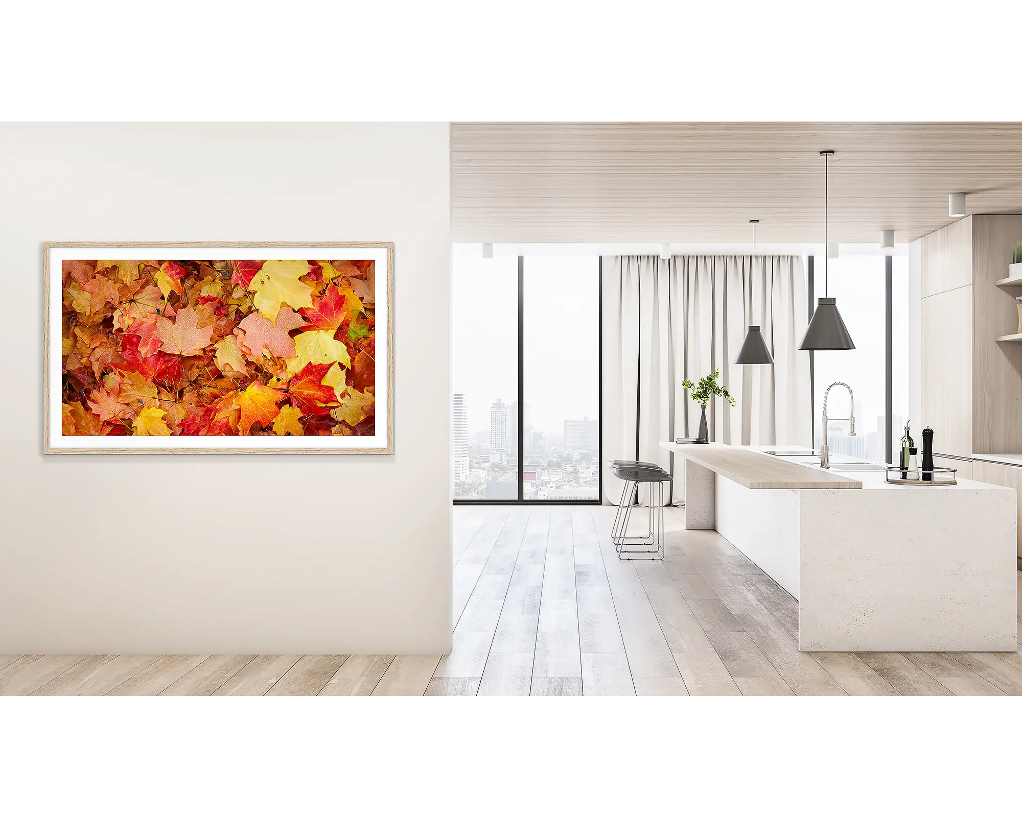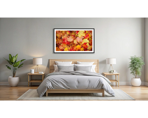 Liven your space with the vibrant hues of AUTUMN LAYERS. Capturing the beauty of fallen leaves in the Victorian alpine town of Bright, this print will infuse your space with the rich colours of autumn. Perfect for those craving a touch of seasonal charm, it adds warmth and vibrancy to any room. Choose a Tassie Oak frame for a complimentary finish.