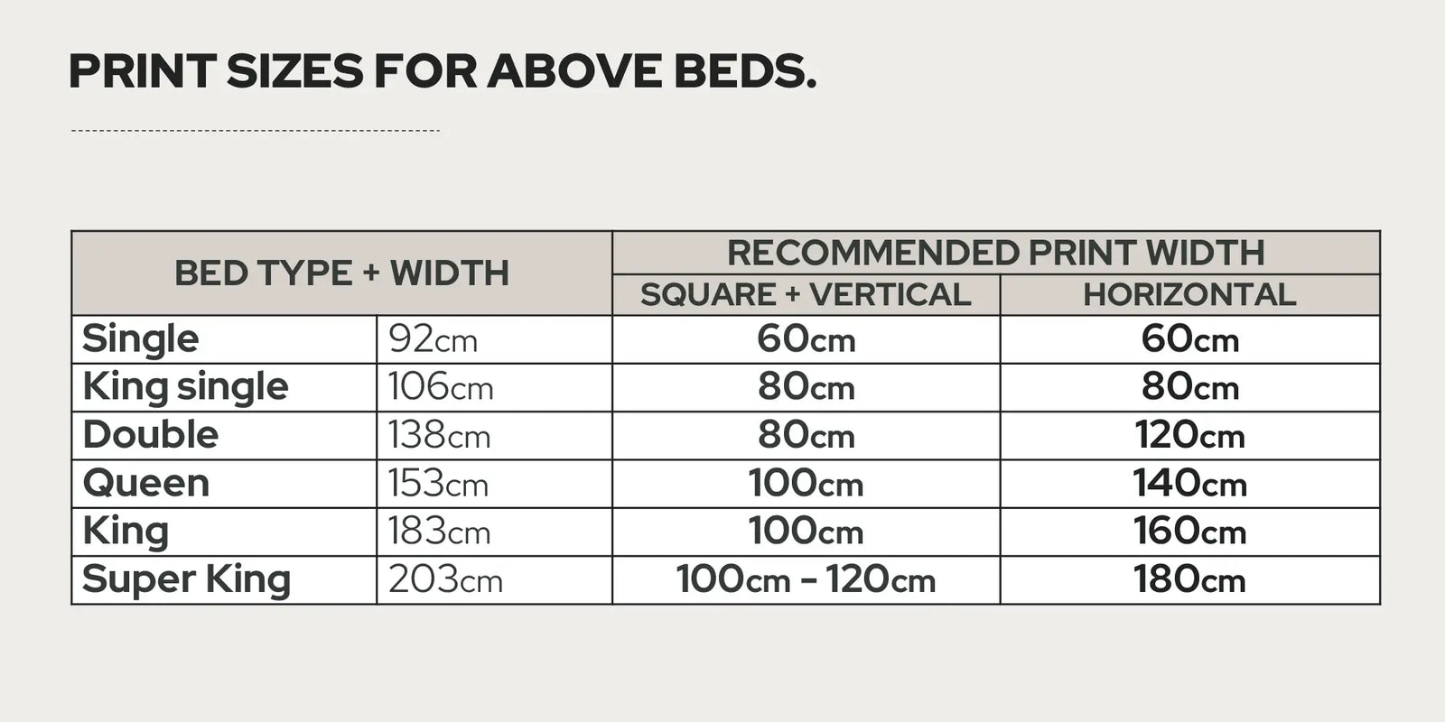 If you intend on hanging your wall art above furniture such as a bed, lounge or table, we generally advise selecting a size narrower than the width of the furniture. Ultimately though, optimum print size is largely about surface area.