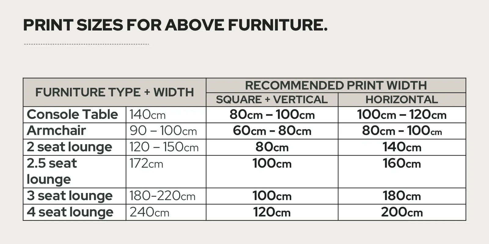 Our size charts below are an easy way to determine the optimum size for wall art against standard furniture dimensions. We list the maximum width as a guide.