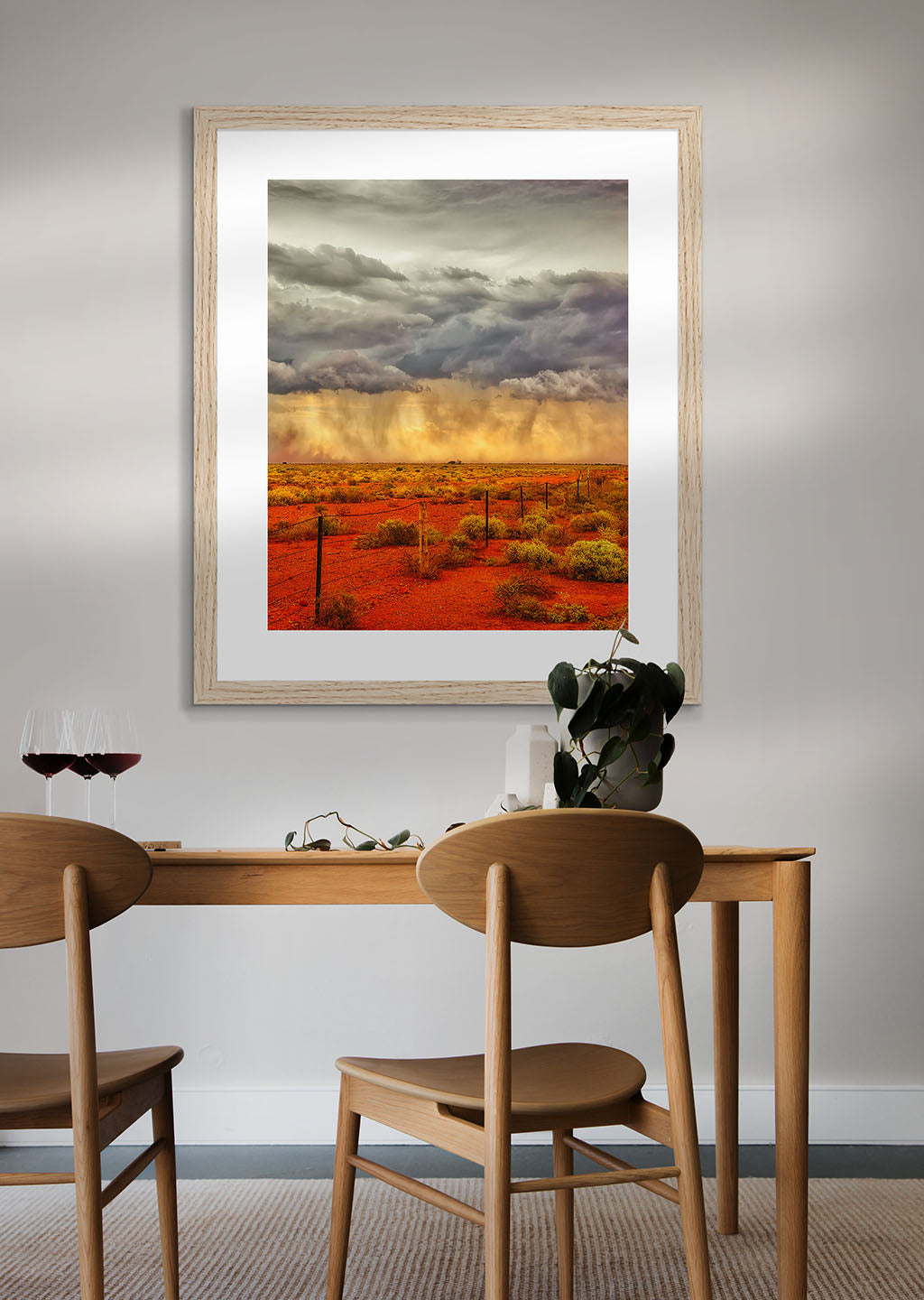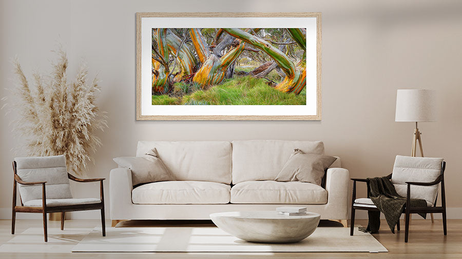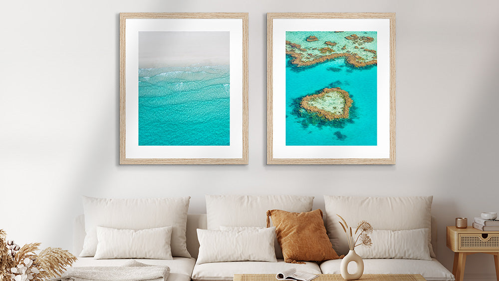 The wall art you choose can either compliment a space or set the intention for a design. If you’re not starting from scratch, consider the furniture already in the room and how the wall art may interact with these elements. If you plan to place artwork above a large sofa, but don’t have very high ceilings then you may want to opt for a large panoramic print or pairing two smaller vertical or square prints so as to not compromise the artworks impact on the space. Have a think about what framing style you might like to go for and how this works with your vision for the space. You may want to opt for an acrylic wall mount if you have more modern furniture and are after a frameless look where as you may want a raw wood frame to match timber furniture. If you move around a lot or want a framing style that will work anywhere, going a timeless white shadow box frame is a safe choice.